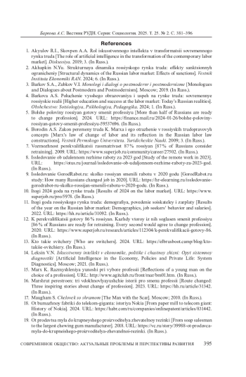 2. Ахапкин Н.Ю. Структурная динамика российского рынка труда: эффекты санкционных ограничений // Вестник Института экономики РАН. 2024. № 6. DOI: 10.52180/2073-6487_2024_6_7_23 EDN: SFLLCO