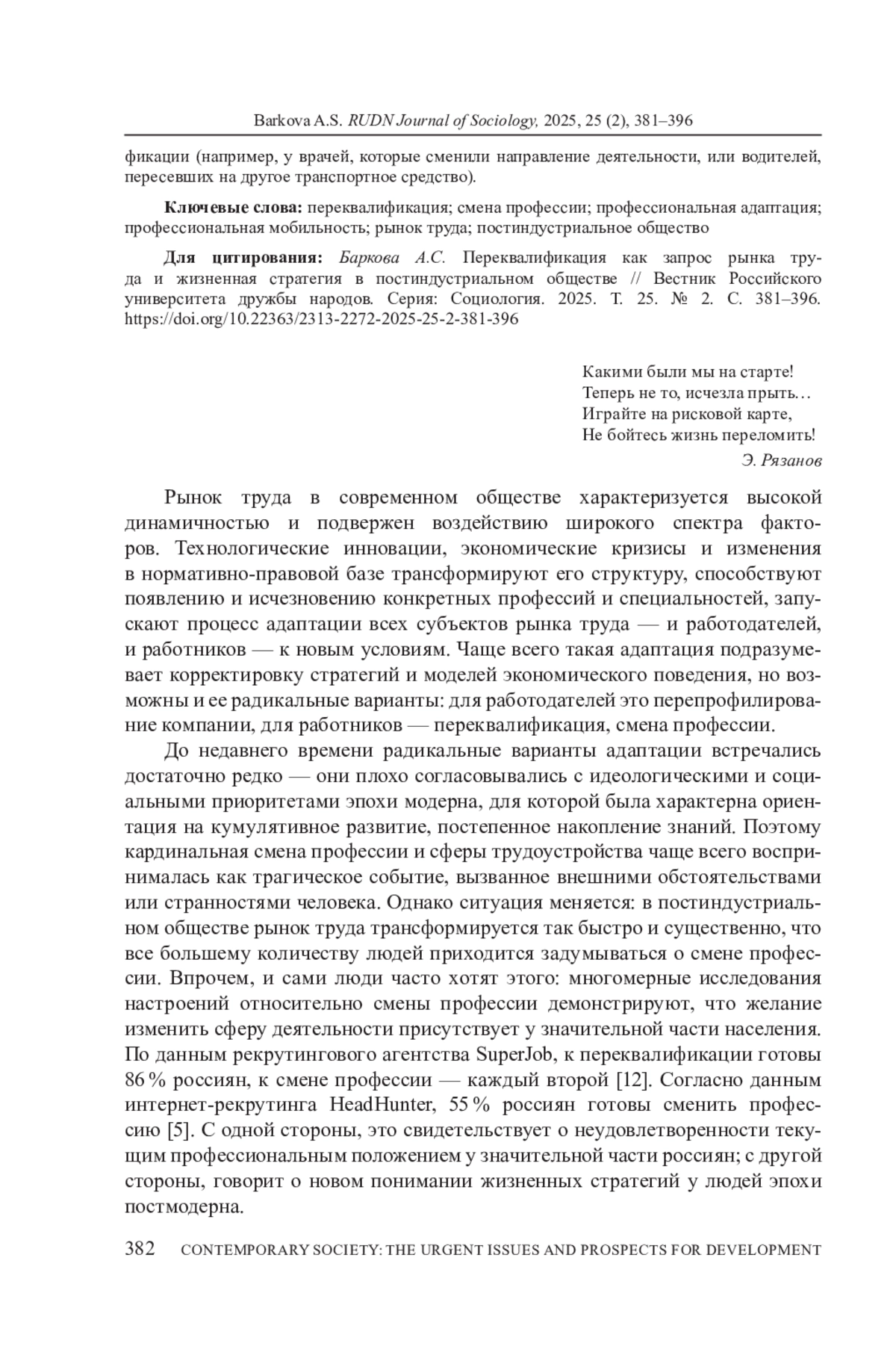 Переквалификации обретает особую актуальность в постиндустриальном обществе, которое характеризуется динамичными социальными и технологическими изменениями, трансформацией рынка труда и, вследствие этого, необходимостью профессиональной адаптации. Статья посвящена комплексному анализу социально-экономического феномена переквалификации в современных реалиях, где технологические инновации, внедрение искусственного интеллекта и изменения в жизненных стратегиях кардинально меняют требования к профессиональным компетенциям. Методологические сложности в изучении переквалификации связаны с отсутствием ее единого понимания. Анализ отечественных и зарубежных источников показывает, что понятия «переквалификация» и «профессиональная переподготовка» часто воспринимаются как синонимы, что искажает статистические данные. Важной исследовательской проблемой является и отсутствие системных механизмов учета полной смены профессии. Системы мониторинга рынка труда, как правило, фиксируют лишь факты профессиональной мобильности, не дифференцируя их по конкретным направлениям или радикальности изменений, что существенно ограничивает возможности анализа эффективности разных моделей переквалификации. Таковая представляет собой сложный многоаспектный процесс, который может носить вынужденный характер или быть инициативным. По радикальности она подразделяется на полную (кардинальная смена профессиональной сферы) и частичную (расширение или углубление компетенций) и тесно связана с разными формами профессиональной мобильности: апшифтингом (переход на более высокую социальную и профессиональную позицию), дауншифтингом (сознательное снижение профессионального статуса) и горизонтальной мобильностью. Каждая форма отражает особые стратегии адаптации работников к изменяющимся условиям рынка труда и реализации личных профессиональных устремлений. Несмотря на обилие ярких примеров успешной кардинальной смены профессии, системный анализ вторичных данных и результатов опросов выявляет парадоксальную тенденцию: значительное количество людей хочет сменить профессию, но большая часть тех, кто осуществил кардинальную переквалификацию, не удовлетворены ее результатами, и это противоречие между медийными историями успеха и реальной статистикой требует осмысления. В то же время наибольший уровень профессиональной удовлетворенности наблюдается у работников, осуществивших нерадикальные формы переквалификации (например, у врачей, которые сменили направление деятельности, или водителей, пересевших на другое транспортное средство).