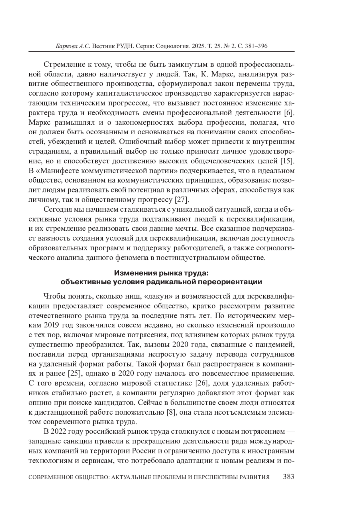 Рынок труда в современном обществе характеризуется высокой динамичностью и подвержен воздействию широкого спектра факторов. Технологические инновации, экономические кризисы и изменения в нормативно- правовой базе трансформируют его структуру, способствуют появлению и исчезновению конкретных профессий и специальностей, запускают процесс адаптации всех субъектов рынка труда — и работодателей, и работников — к новым условиям. Чаще всего такая адаптация подразумевает корректировку стратегий и моделей экономического поведения, но возможны и ее радикальные варианты: для работодателей это перепрофилирование компании, для работников — переквалификация, смена профессии.