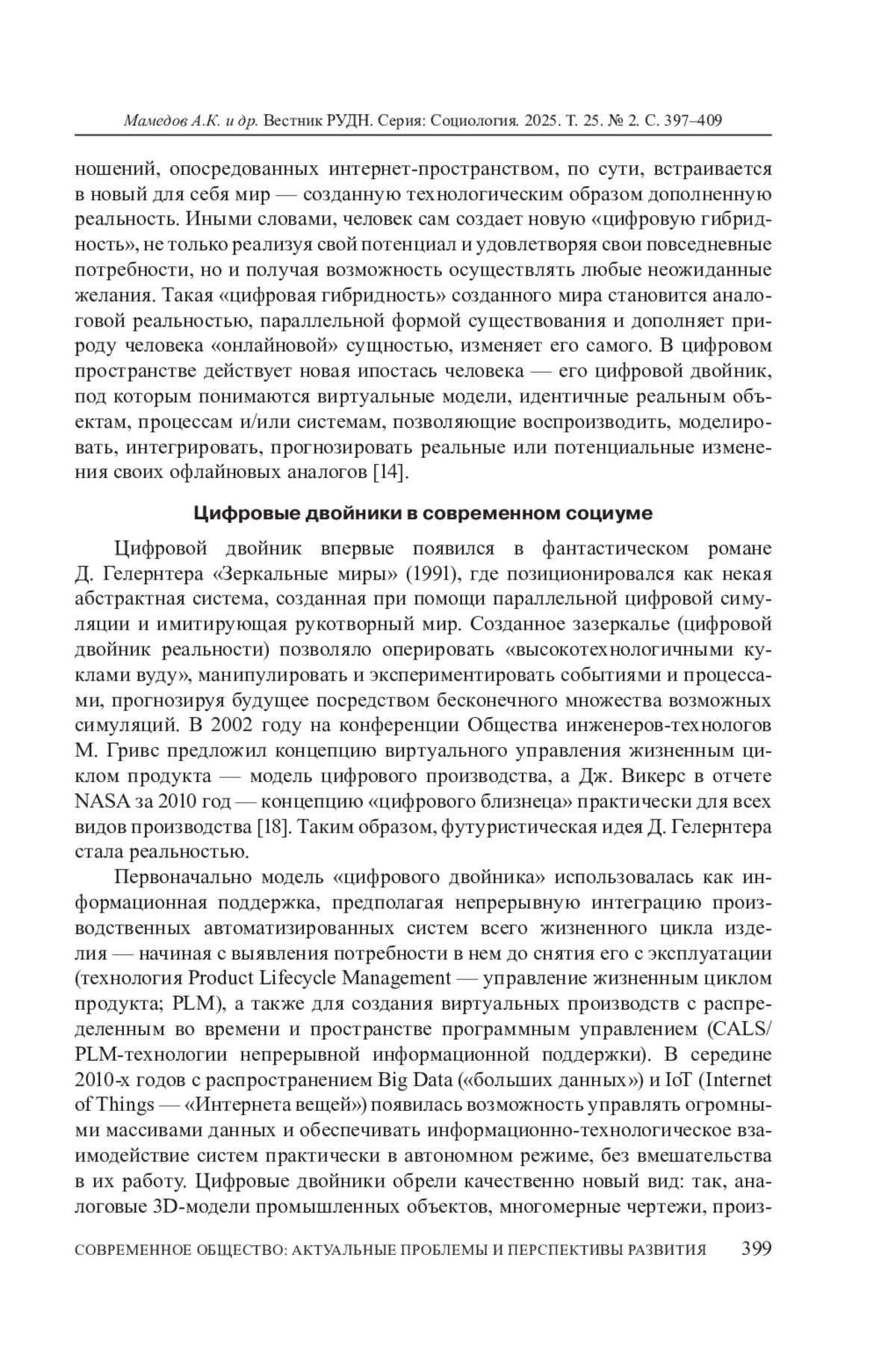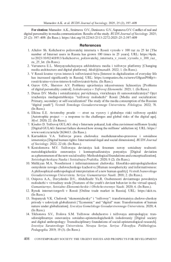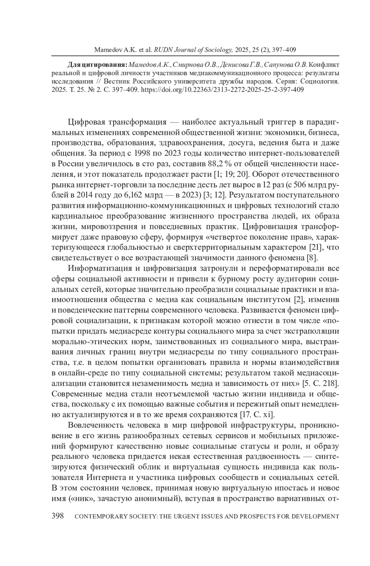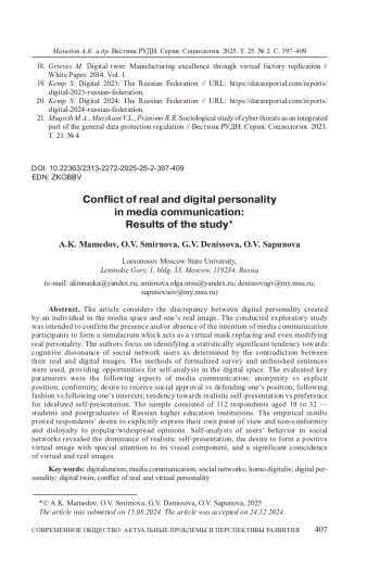 МАМЕДОВ А. К., СМИРНОВА О. В., ДЕНИСОВА Г. В., САПУНОВА О. В. КОНФЛИКТ РЕАЛЬНОЙ И ЦИФРОВОЙ ЛИЧНОСТИ УЧАСТНИКОВ МЕДИАКОММУНИКАЦИОННОГО ПРОЦЕССА: РЕЗУЛЬТАТЫ ИССЛЕДОВАНИЯ // ВЕСТНИК РОССИЙСКОГО УНИВЕРСИТЕТА ДРУЖБЫ НАРОДОВ. СЕРИЯ: СОЦИОЛОГИЯ. 2025. Т. 25 № 2