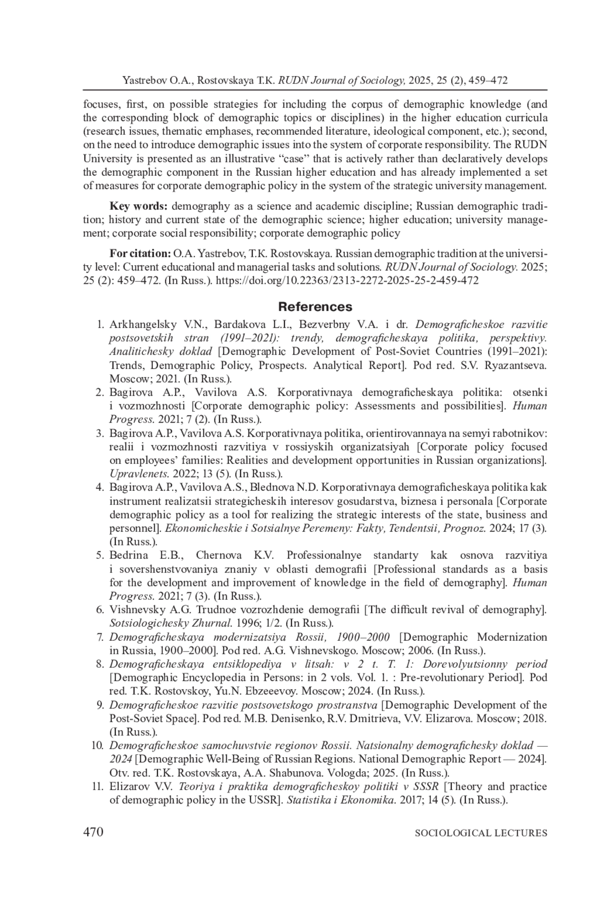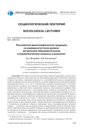 В последние десятилетия российское общество переживает сложные демографические процессы, обусловленные как объективными факторами глобального характера (старение населения, сокращение рождаемости, демографический переход, трансформация ценностей приоритетов молодых поколений в условиях цифровизации, несбалансированные миграционные потоки и т. д.), так и особенностями социально-экономического и политикоидеологического развития постсоветского пространства (внешнее идеологическое влияние, накопленные в советский период нерешенные вопросы, продолжающиеся реформы образования, межконфессиональное и многонациональное жизненное пространство со множеством локальных и региональных сочетаний групповых и коллективных приоритетов и т. д.). Признавая важность демографических вопросов для обеспечения национальной безопасности, государство приняло целый ряд программный документов, призванных улучшить демографические показатели не только с помощью финансово-стимулирующих документов, но и за счет расстановки более четких ценностных приоритетов семейной и демографической политики на долгосрочный период. Однако обеспечить демографическую устойчивость и безопасность российского общества невозможно лишь целенаправленными усилиями «сверху» - необходимо консолидировать работу государственных структур, научных учреждений и образовательных институций. Опираясь на свой профильный экспертный опыт, авторы обозначают возможные направления такой консолидации одновременно на трех уровнях социального управления - государственные целевые программы и национальные проекты (условный макроуровень), расширение профессионального кругозора молодежи за счет продуманного включения в программы подготовки специалистов демографического компонента исторического и обзорного характера (условный микроуровень) и дополнение демографической проблематикой корпоративной культуры конкретных организаций (условный мезоуровень). В статье акцент сделан, во-первых, на возможных стратегиях включения корпуса демографических знаний (и соответствующего блока демографических тематик или дисциплин) в учебные программы высшего образования (исследовательские вопросы, содержательные акценты, рекомендуемая литература, просвещенческо-идеологическая компонента и т. д.); во-вторых, на необходимости введения демографической проблематики в систему корпоративной ответственности. Российский университет дружбы народов представлен как показательный «кейс», деятельно, а не декларативно заинтересованный в развитии демографического компонента в системе российского высшего образования и уже реализующий комплекс мер корпоративной демографической политики в рамках стратегического университетского управления.