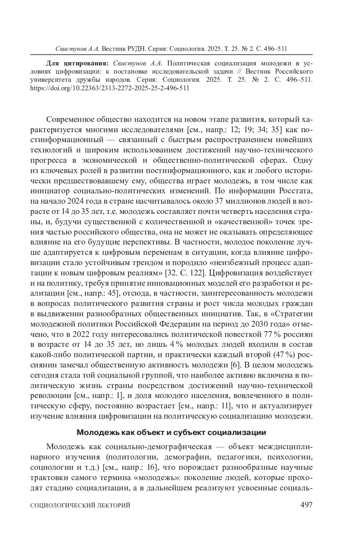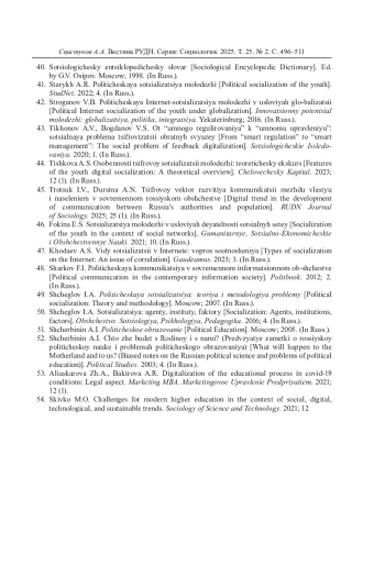 36. Самсонова Т.Н., Леонов Е.К. Роль интернета в политической социализации современной российской молодежи // Вестник Московского университета. Серия 18: Социология и политология. 2022. Т. 28. № 4. EDN: OOTHYR