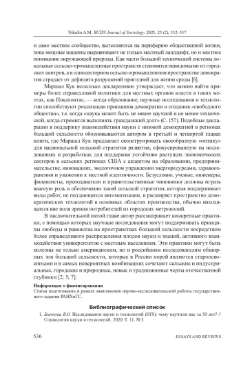 Cтатья представляет собой рецензию на книгу К. Маршал Кук «Большая сельскость: сельско-промышленные районы, демократия и не только» (Ланхэм: Изд-во Лексингтон Букс, 2024. 280 с.). Это оригинальное исследование долговременных сельско-городских трансформаций региона Аппалачей, особенно угольного месторождения Покахонтас: Кук кратко реконструирует социальную историю этого региона, бывшего до второй половины XX века одним из основных драйверов экономического - не только индустриального, но и сельского - роста США, но вот уже как полвека оказавшегося в колее долговременной депрессии, которая обусловлена прежде всего истощением местных природных ресурсов и породила рост безработицы и демографическую депопуляцию. В книге показаны причины долговременной деградации природы и социума Аппалачей на основе подходов STS (социотехнические системы - social-technical systems), в которых объекты исследования выступают как лаборатории не только для научнотехнических, но и социально-гуманитарных экспериментов. Также Кук на протяжении всей книги подчеркивает важность сохранения локального знания как условия устойчивого территориального развития. В то же время книга содержит и в определенной степени декларативно-активистские тезисы деятельностного сопротивления депрессии в регионе Аппалачей посредством осознания и признания роли и ответственности науки за развитие низовой демократии на местах.