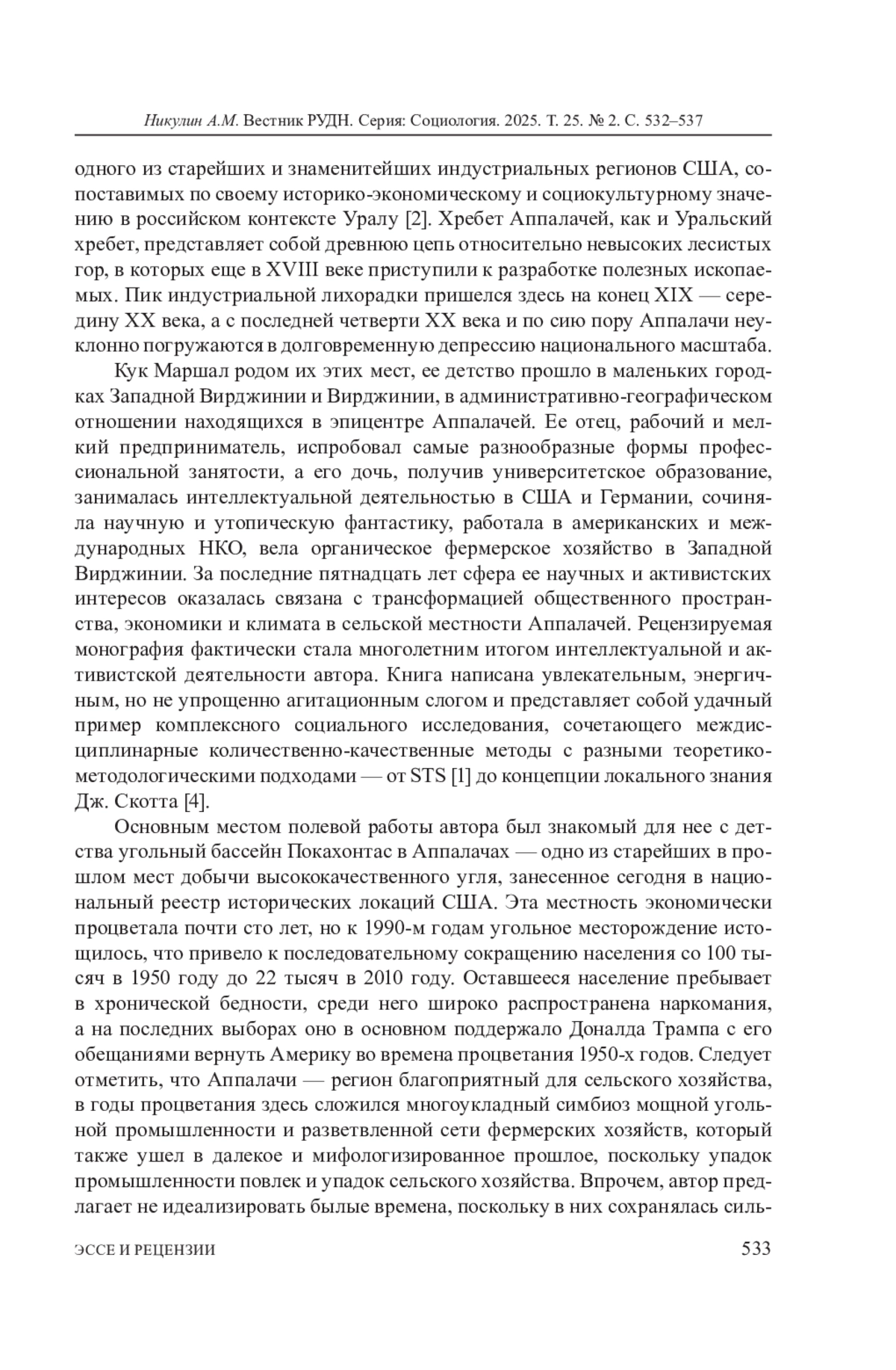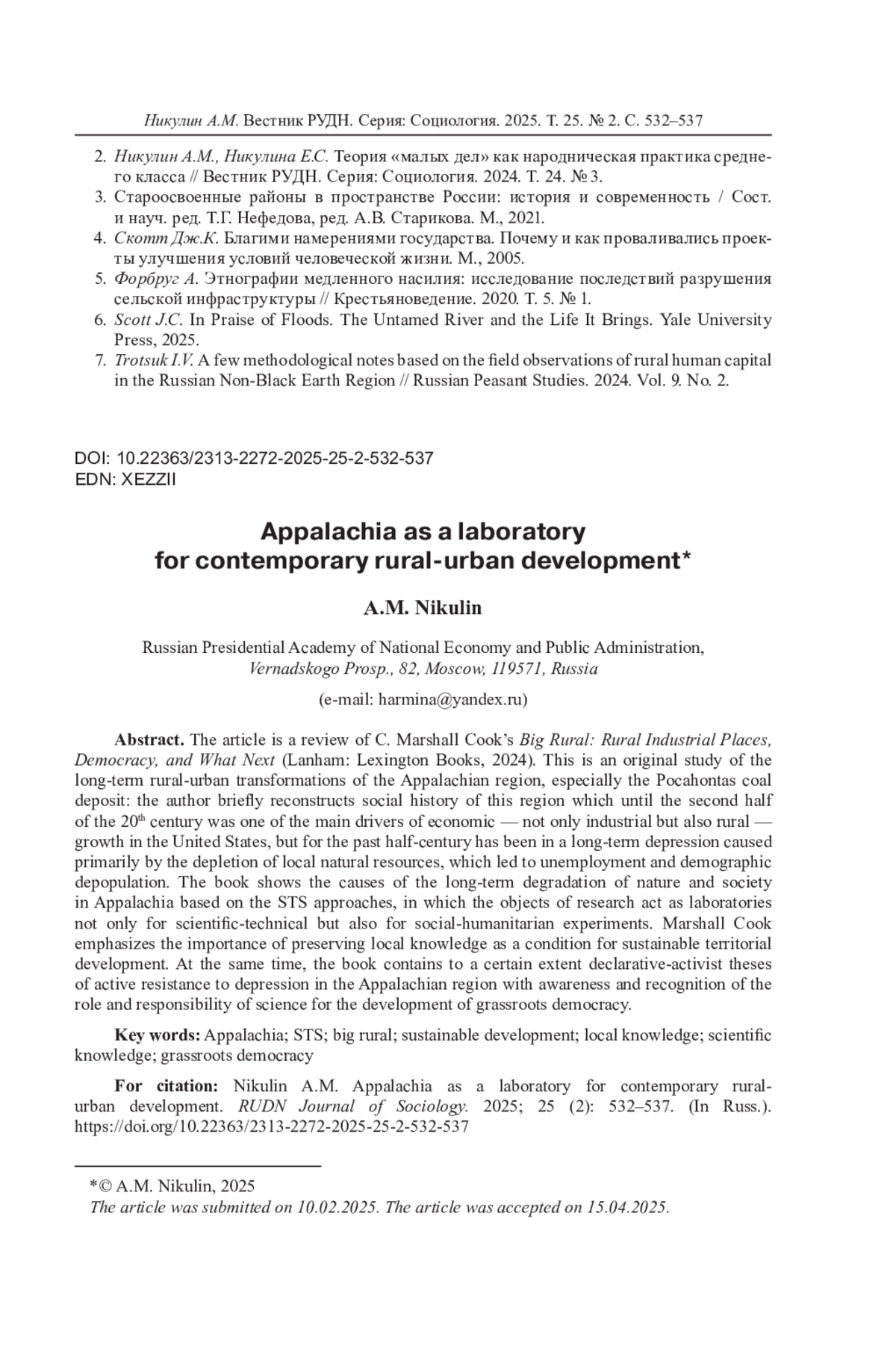 НИКУЛИН А. М. АППАЛАЧИ КАК ЛАБОРАТОРИЯ СОВРЕМЕННОГО СЕЛЬСКО-ГОРОДСКОГО РАЗВИТИЯ // ВЕСТНИК РОССИЙСКОГО УНИВЕРСИТЕТА ДРУЖБЫ НАРОДОВ. СЕРИЯ: СОЦИОЛОГИЯ. 2025. Т. 25 № 2