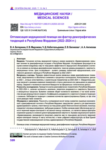 Введение. Улучшение системы медицинской помощи в рамках нацпроекта «Здравоохранение» оказывает влияние на демографическую ситуацию в Республике Мордовия. Исследование фокусируется на оценке влияния внедряемых мер по повышению эффективности медицинского обслуживания в контексте их влияния на ключевые демографические показатели, такие как уровень рождаемости, смертности, миграционные потоки. Цель исследования – выявить динамику показателей народонаселения, естественного движения и миграции в Республике Мордовия за 2022–2024 гг.
