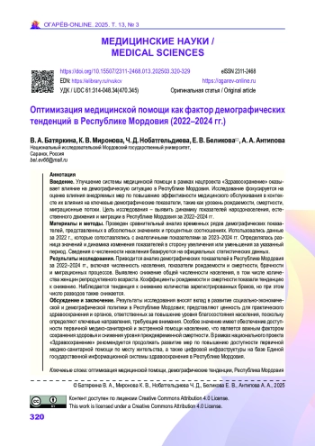 Обсуждение и заключение. Результаты исследования вносят вклад в развитие социально-экономической и демографической политики в Республике Мордовия; представляют ценность для практического здравоохранения и органов, ответственных за повышение уровня благосостояния населения, поскольку определяют ключевые направления, требующие внимания. Особое значение имеет обеспечение доступности первичной медико-санитарной и экстренной помощи населению, что является важным фактором сохранения здоровья и снижения уровня преждевременной смертности. В рамках национального проекта «Здравоохранение» рекомендуется продолжать развитие мер по повышению доступности первичной медико-санитарной помощи по месту жительства, а также цифровой инфраструктуры на базе Единой государственной информационной системы здравоохранения в Республике Мордовия.