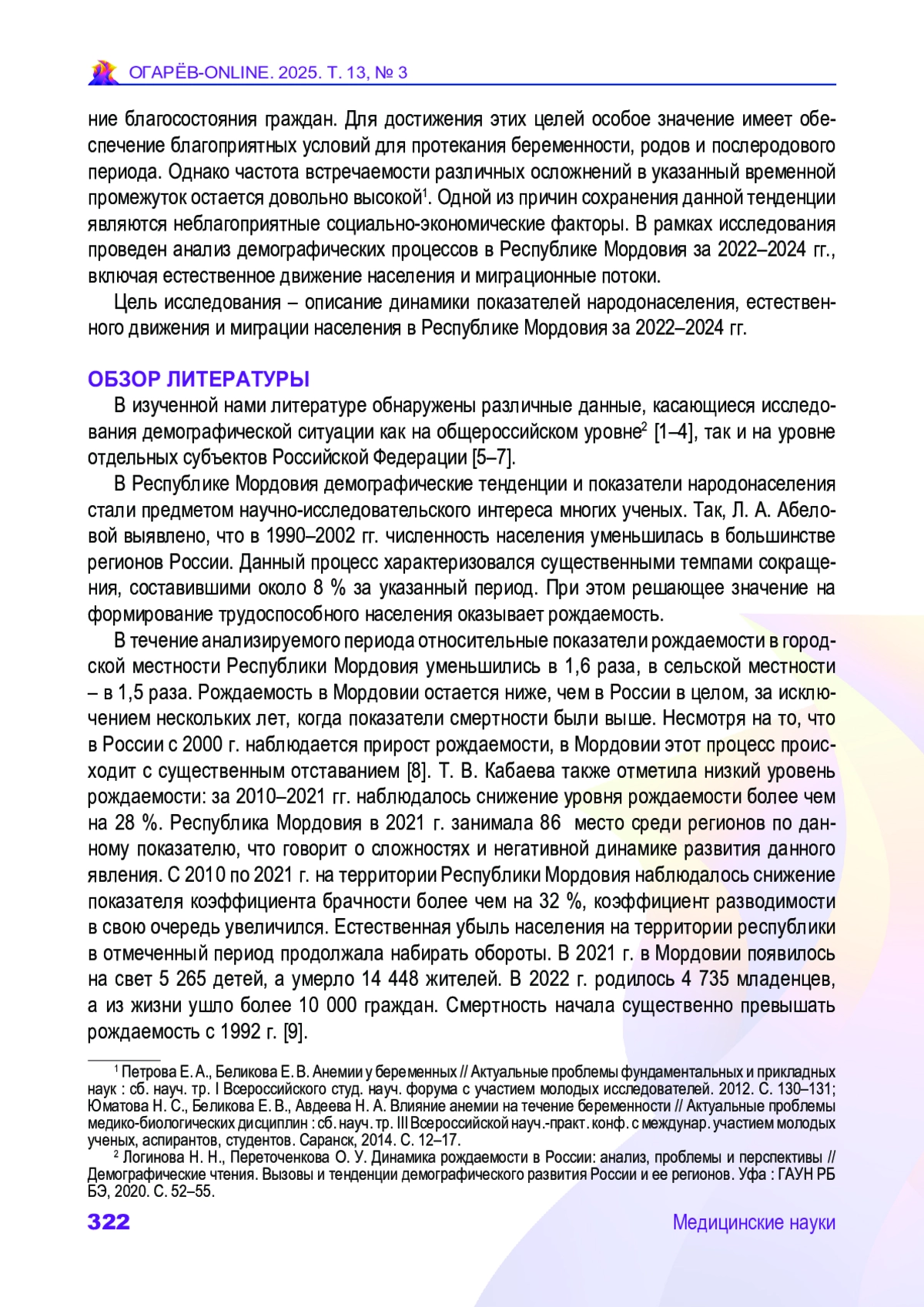 8. Абелова Л. А. Естественное движение населения и формирование трудовых ресурсов Мордовии в трансформационный период // Регионология. 2008. № 2. С. 173-175.