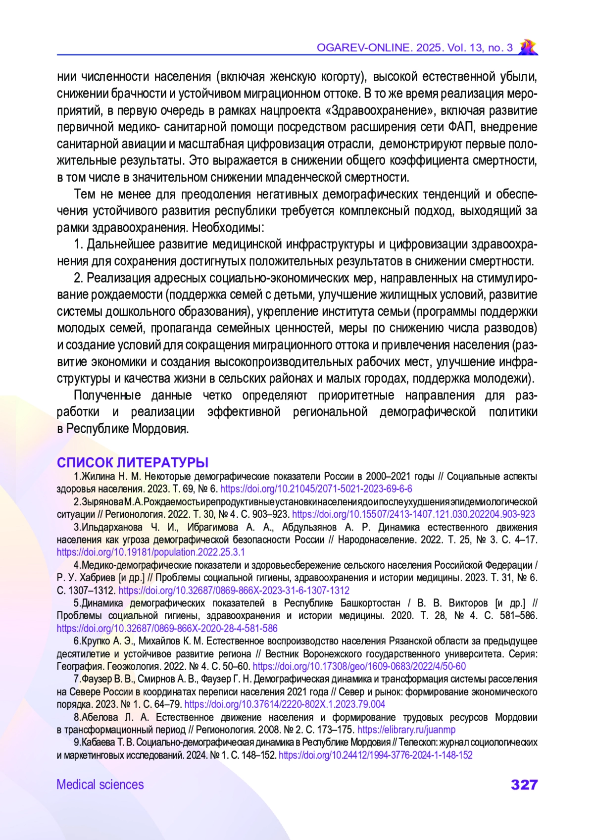 9. Кабаева Т. В. Социально-демографическая динамика в Республике Мордовия // Телескоп: журнал социологических и маркетинговых исследований. 2024. № 1. С. 148-152. DOI: 10.24412/1994-3776-2024-1-148-152
