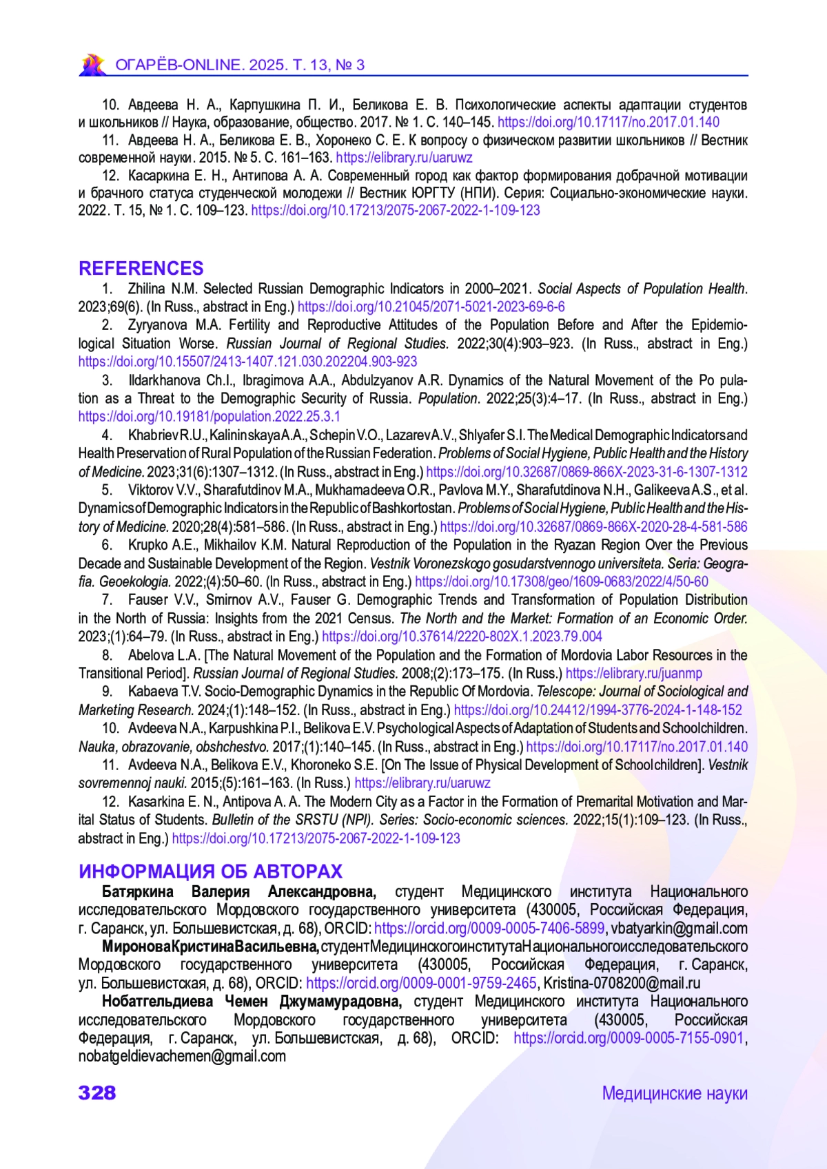 1. Жилина Н. М. Некоторые демографические показатели России в 2000-2021 годы // Социальные аспекты здоровья населения. 2023. Т. 69, № 6. DOI: 10.21045/2071-5021-2023-69-6-6