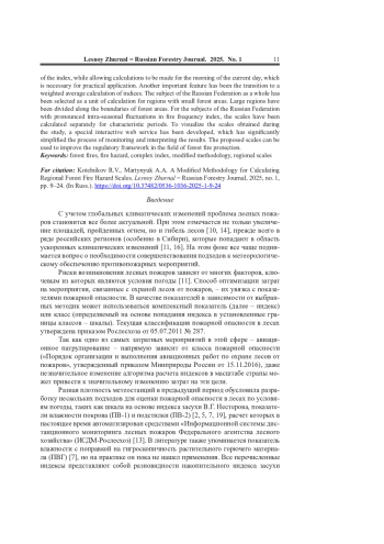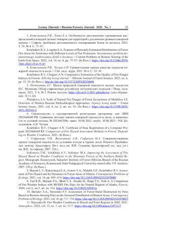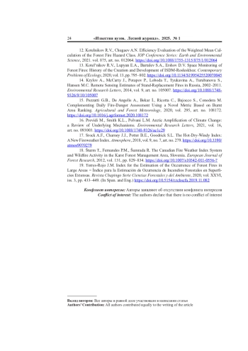 4. Котельников Р.В., Чугаев А.Н. Сравнительная оценка качества индексов пожарной опасности в лесах // Сиб. лесн. журн. 2023. No 6. С. 32-38. EDN: MJAZUV