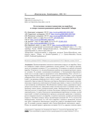 Проанализированы показатели накопления подроста на вырубках Западно-Сибирского северо-таежного равнинного лесного района. Учет подроста производился на площадках размером 2×2 м в количестве 30 площадок на каждой изучаемой вырубке. Отмечается, что лесовозобновление в районе исследования протекает довольно успешно. В условиях зеленомошно-ягодникового и багульникового-брусничного типов леса в составе подроста встречаются сосна обыкновенная (Pinus sylvestris L.), березы повислая (Betula pendula Roth.) и пушистая (B. рubescens Ehrh.), сосна кедровая сибирская (Pinus sibirica Rupr.), осина (Populus tremula L.), ель сибирская (Picea obovata Ledeb.), лиственница сибирская (Larix sibirica Ledeb.) с доминированием сосны обыкновенной и березы повислой. Высокая доля березы объясняется ежегодным семеношением вида и переносом семян ветром на большие расстояния, а также ее способностью к вегетативному возобновлению. Возобновление хвойных пород сдерживается периодичностью семенных лет, зависанием семян в лесной подстилке и слоевищах мхов. Эти проблемы можно решить минерализацией почвы. Минерализацию лучше сочетать с очисткой лесосек от порубочных остатков. Последние сгребаются бульдозером на трелевочный волок с 2 сторон. В результате перемешивания порубочных остатков с лесной подстилкой и почвой активизируются процессы деструкции древесины и минимизируется пожарная опасность на вырубке, создаются идеальные условия для накопления подроста. Основная площадь между трелевочными волоками (65-70 %) остается без минерализации, поскольку на этой части вырубки в процессе проведения лесосечных работ сохраняется максимальное количество подроста предварительной генерации. В условиях подзоны северной тайги Ханты-Мансийского автономного округа - Югры, где средний прирост древесины составляет 0,6 м3/га, сырьевое значение древостоев уступает место экологическому. Учитывая важную экологическую роль берез повислой и пушистой, целесообразно утвердить их в качестве главных древесных пород. Это позволит ускорить перевод вырубок в покрытые лесной растительностью земли и снизить неоправданно высокую долю площади лесокультурного фонда.