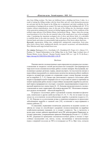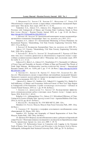 5. Залесова Е.С., Белов Л.А., Залесов С.В., Тимербулатов Ф.Т., Чермных А.И. Влияние типа леса и полноты древостоев на обеспеченность подростом спелых и перестойных сосняков подзоны северной тайги // Междунар. науч.-исследоват. журн. 2019. No 11 (89). Ч. 2. С. 37-41. EDN: ZLJTUQ