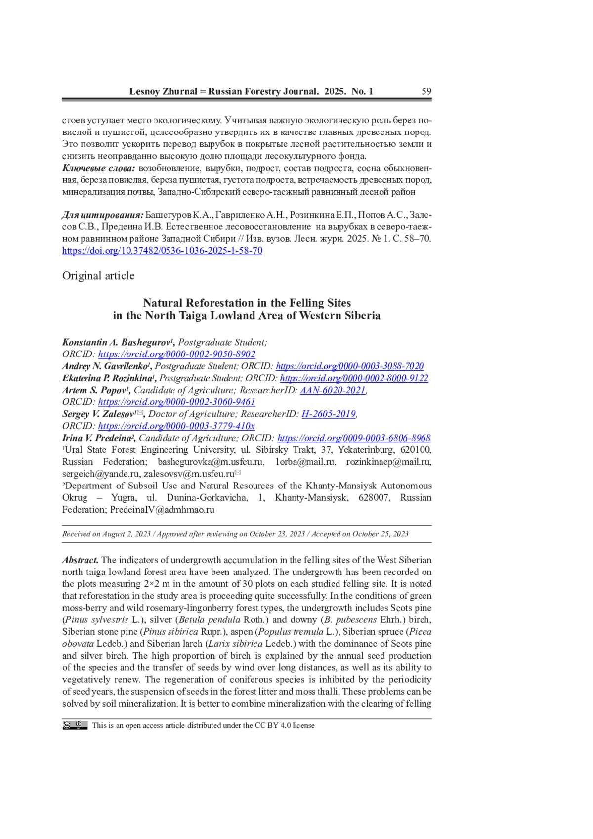 6. Залесова Е.С., Залесов С.В., Терехов Г.Г., Толкач О.В., Луганский Н.А., Шубин Д.А. Обеспеченность спелых и перестойных светлохвойных насаждений Западно-Уральского таежного лесного района подростом предварительной генерации // Успехи соврем. естествознания. 2019. No 1. С. 39-44. EDN: YYIIHZ