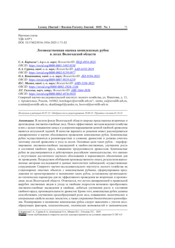 В лесном фонде Вологодской области широко представлены вторичные и производные лиственно-хвойные леса. Поиск эффективных методов ведения хозяйства в них с целью повышения запаса и ускорения выращивания ценной хвойной древесины является актуальной задачей. В качестве варианта ее решения может рассматриваться своевременное и научно обоснованное проведение комплексных рубок. Комплексные рубки осуществляются в разновозрастных и сложных древостоях и должны сочетать заготовку спелой древесины и уход за лесом. Основные цели таких рубок - переформирование лиственно-хвойных насаждений в хвойно-лиственные, улучшение роста и состояния хвойного яруса, повышение продуктивности древостоев. Комплексные рубки не рассматриваются в действующем российском законодательстве, что связано с отсутствием достаточного научного обоснования и нормативного обеспечения для их проведения. Посредством обобщения производственного опыта, результатов выполненных авторами исследований и данных многолетних наблюдений, осуществляемых сотрудниками Северного научно-исследовательского института лесного хозяйства на стационарных опытных объектах с комплексными рубками, сформулированы предложения по проектированию и назначению таких рубок, установлены организационно-технические параметры для их эффективного проведения во вторичных и производных лесах Вологодской области. Отмечается, что путем своевременной и правильной вырубки лиственных видов и ухода за хвойным подростом возможно преобразовать лиственно-хвойные насаждения в хвойные, добиться улучшения роста и состояния хвойного яруса, производительности древостоя. Кроме того, комплексные рубки должны способствовать улучшению средообразующей роли леса, повышению экологических и специальных свойств лесных экосистем, а также сохранению биологического разнообразия. Планирование и назначение комплексных рубок следует выполнять с учетом лесообразующих факторов, технологических, технических возможностей и экономических показателей. Правильный, научно обоснованный подход к проведению комплексных рубок позволит повысить их лесоводственную и экономическую эффективность.