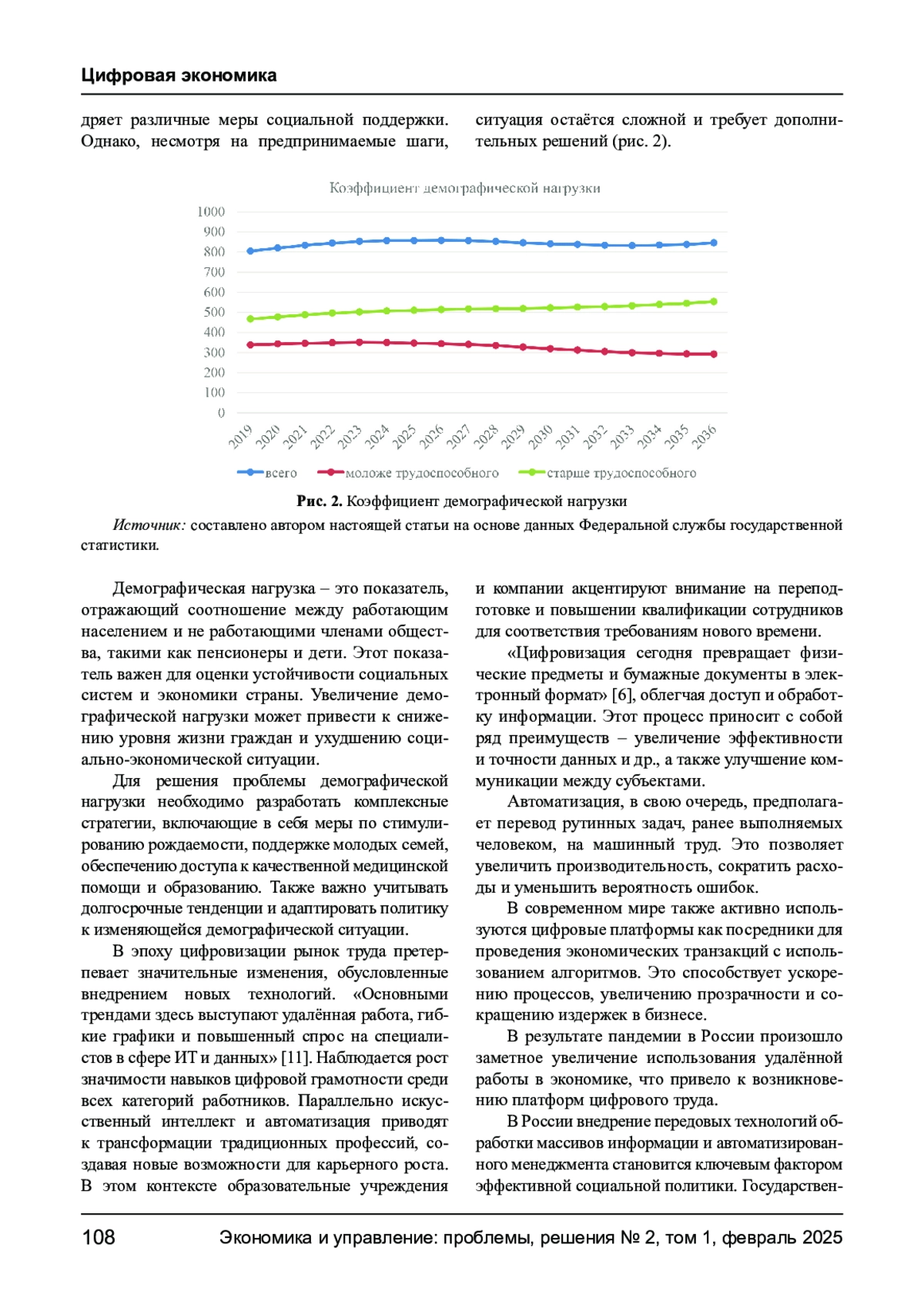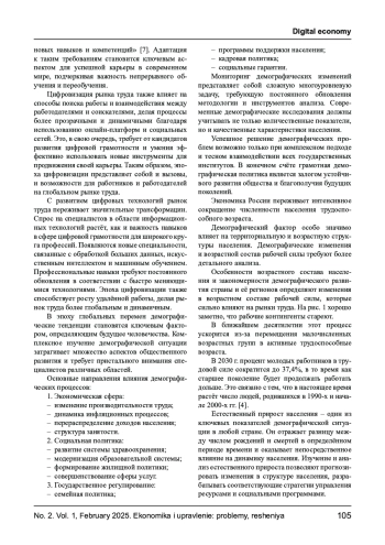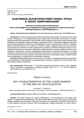 В статье рассматривается влияние процесса цифровизации на развитие рынка труда России. Определено то, что цифровизация рынка труда влияет на способы поиска работы и взаимодействия между работодателями и соискателями, делая процессы более прозрачными и динамичными благодаря использованию онлайн-платформ и социальных сетей. С развитием цифровых технологий рынок труда переживает значительные трансформации. Спрос на специалистов в области информационных технологий растёт, как и важность навыков в сфере цифровой грамотности для широкого круга профессий. Появляются новые специальности, связанные с обработкой больших данных, искусственным интеллектом и машинным обучением. Профессиональные навыки требуют постоянного обновления в соответствии с быстро меняющимися технологиями. В заключение отмечено, что перед учёными и экспертами встают новые исследовательские вопросы, связанные с институционализацией и институциональным регулированием новых форм занятости и организации труда в условиях развития противоречивых и неоднозначных экономических моделей.