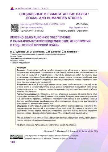 Введение. Исследование проблем лечебно-эвакуационного обеспечения и санитарно-противоэпидемических мероприятий, проводившихся в годы Первой мировой войны, обосновано недостаточностью их раскрытия в историографии и отсутствием обобщающих работ по тематике. Цель исследования – изучение особенностей развития медицины в странах, участвовавших в Первой мировой войне, в условиях нехватки ресурсов для организации медицинской помощи и проведения санитарно-противоэпидемических мероприятий.