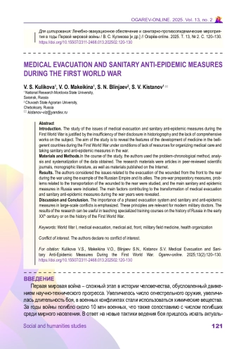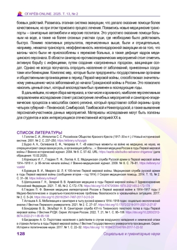 2. Будко А. А., Селиванов Е. Ф., Чигарева Н. Г. “В известные моменты на войне не медицина, не наука, не операция играют самую важную роль, а организация работы…”: Военная медицина России в годы Первой мировой войны // Военно-исторический журнал. 2004. № 8. С. 57-62. URL: https://warlib.site/budko-selivanov-chigareva/ (дата обращения: 10.02.2025).