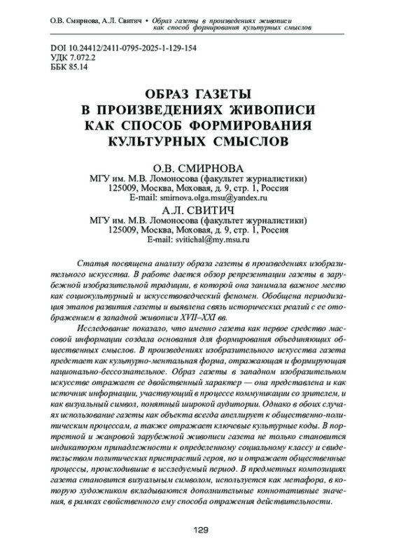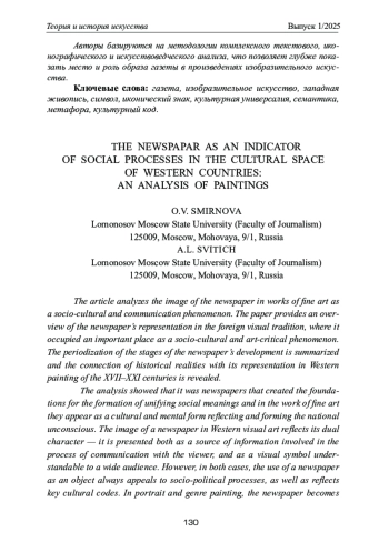 Статья посвящена анализу образа газеты в произведениях изобразительного искусства. В работе дается обзор репрезентации газеты в зарубежной изобразительной традиции, в которой она занимала важное место как социокультурный и искусствоведческий феномен. Обобщена периодизация этапов развития газеты и выявлена связь исторических реалий с ее отображением в западной живописи XVII‒XXI вв. Исследование показало, что именно газета как первое средство массовой информации создала основания для формирования объединяющих общественных смыслов. В произведениях изобразительного искусства газета предстает как культурно-ментальная форма, отражающая и формирующая национально-бессознательное. Образ газеты в западном изобразительном искусстве отражает ее двойственный характер — она представлена и как источник информации, участвующий в процессе коммуникации со зрителем, и как визуальный символ, понятный широкой аудитории. Однако в обоих случаях использование газеты как объекта всегда апеллирует к общественно-политическим процессам, а также отражает ключевые культурные коды. В портретной и жанровой зарубежной живописи газета не только становится индикатором принадлежности к определенному социальному классу и свидетельством политических пристрастий героя, но и отражает общественные процессы, происходившие в исследуемый период. В предметных композициях газета становится визуальным символом, используется как метафора, в которую художником вкладываются дополнительные коннотативные значения, в рамках свойственного ему способа отражения действительности.