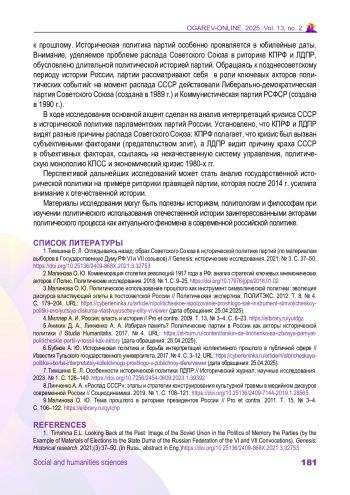 1. Тимшина Е. Л. Оглядываясь назад: образ Советского Союза в исторической политике партий (по материалам выборов в Государственную Думу РФ VI и VII созывов) // Genesis: исторические исследования. 2021. № 3. С. 37-50. DOI: 10.25136/2409-868X.2021.3.32753