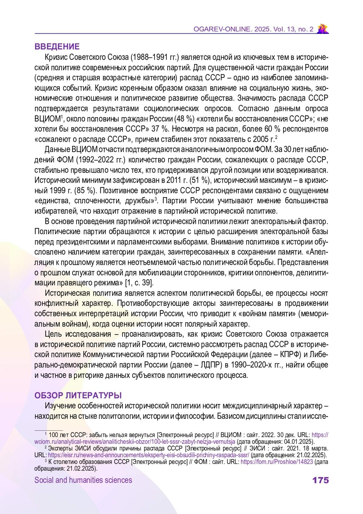Введение. Распад СССР – одно из наиболее значимых событий в истории XX в. Политические партии учитывают значимость данного исторического события, что отражается в их риторике. Коммунистическая партия Российской Федерации (КПРФ) и Либерально-демократическая партия России (ЛДПР) рассматриваются как ключевые акторы исторической политики в России, так как эти партии с 1990-х гг. актуализируют память о распаде СССР. Цель исследования – рассмотреть особенности актуализации кризиса Советского Союза в исторической политике КПРФ и ЛДПР.