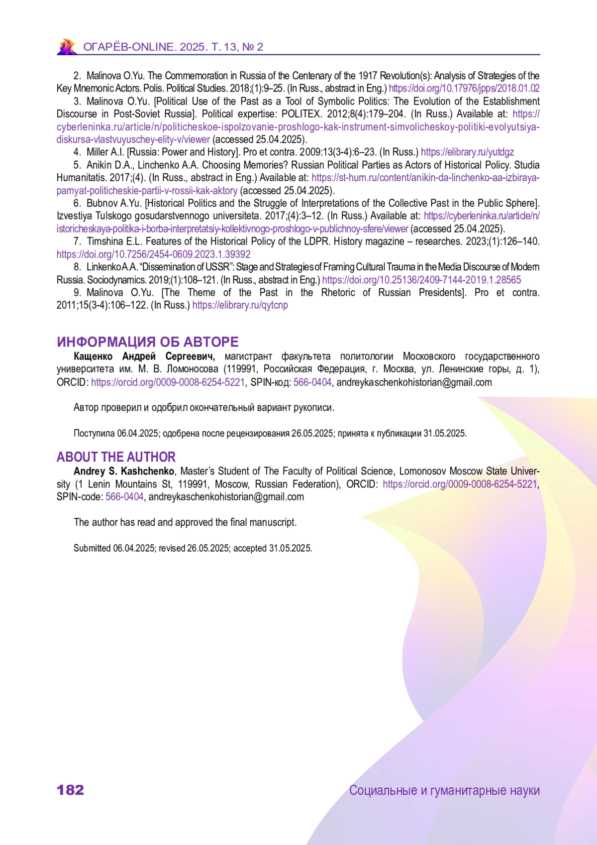 2. Малинова О. Ю. Коммеморация столетия революций 1917 года в РФ: анализ стратегий ключевых мнемонических акторов // Полис. Политические исследования. 2018. № 1. С. 9-25. DOI: 10.17976/jpps/2018.01.02