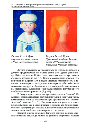 В статье впервые рассматривается вопрос влияния творчества Дж. де Кирико раннего периода (1900-е — 10-е годы XX в.), его «метафизической живописи», на развитие творчества итальянского художника Антонио Буэно. Отмечается, что влияние ключевых стилистических особенностей художественного письма признанного главы авангардного направления «метафизической живописи» неоднозначно сказалось на поисках молодым художником собственного художественного «почерка». Автор опирается на методологию комплексного междисциплинарного подхода к рассмотрению вопроса влияния творчества де Кирико на поиски «современного стиля» живописи начинающим художником. Исследование проведено как по материалам дневника-воспоминаний А. Буэно, так и на основе анализа его живописного наследия. Делается вывод, что из произведений ранней живописи Дж. де Кирико А. Буэно воспринял лишь некоторые особенности художественно-живописного стиля «метафизической живописи», которые, однако, глубоко повлияли на развитие индивидуально-стилевой «манеры» А. Буэно и определили в эволюции его творчества наиболее устойчивые и характерные черты и принципы формообразования в его произведениях, снискавших ему национальное и международное признание