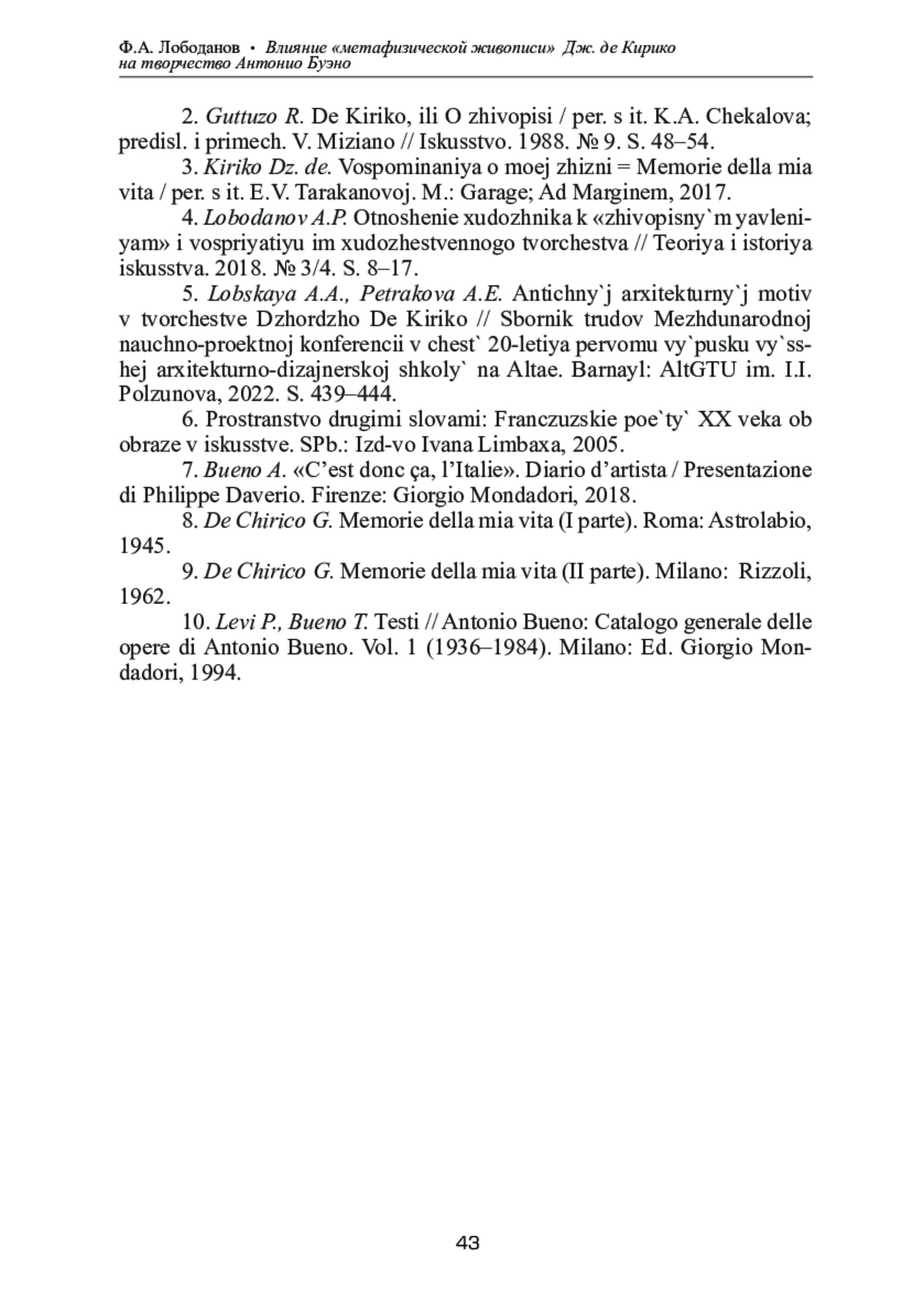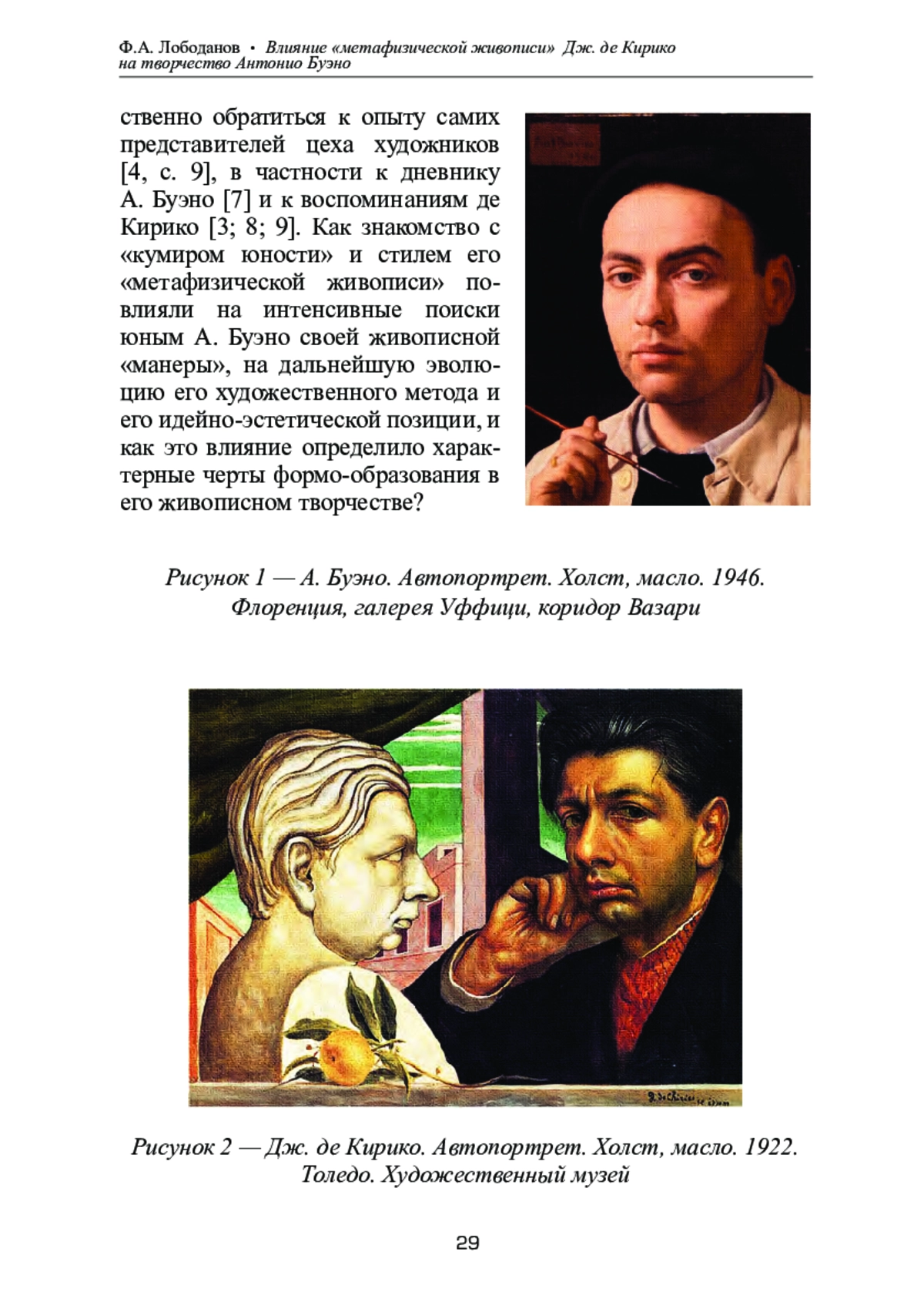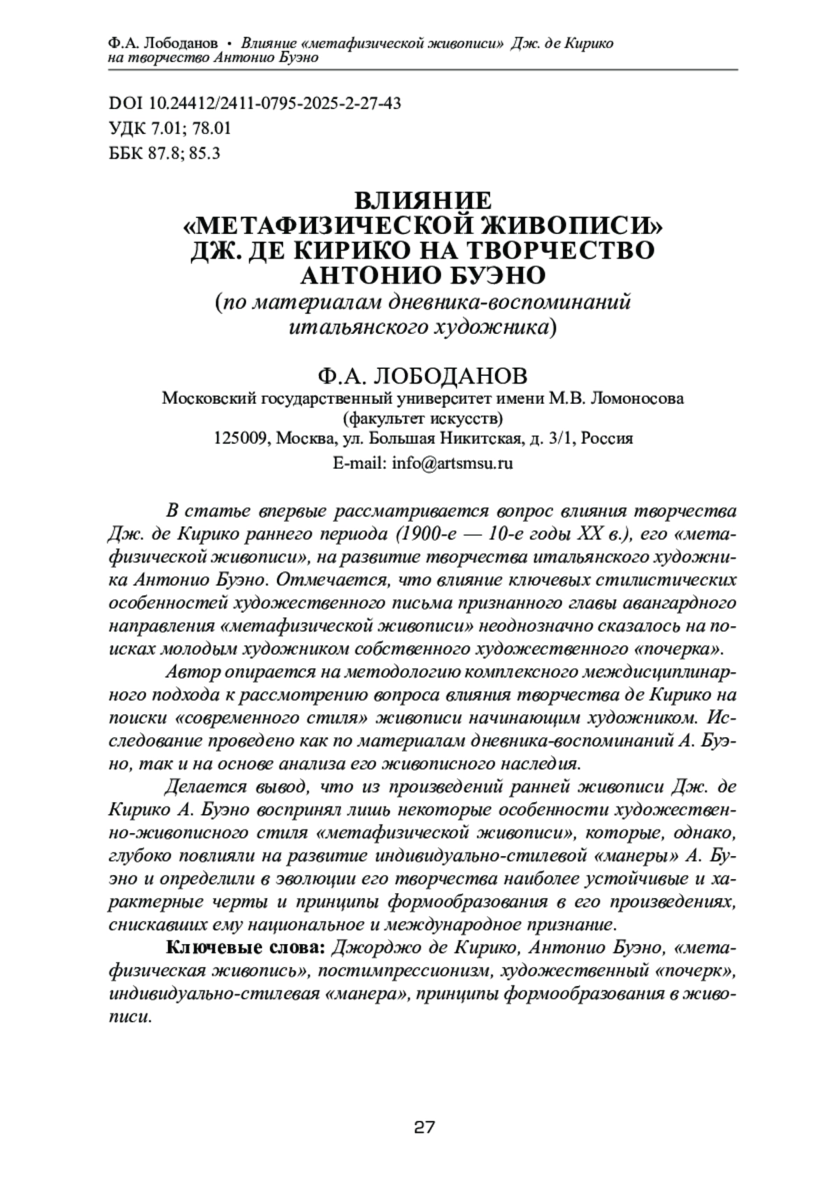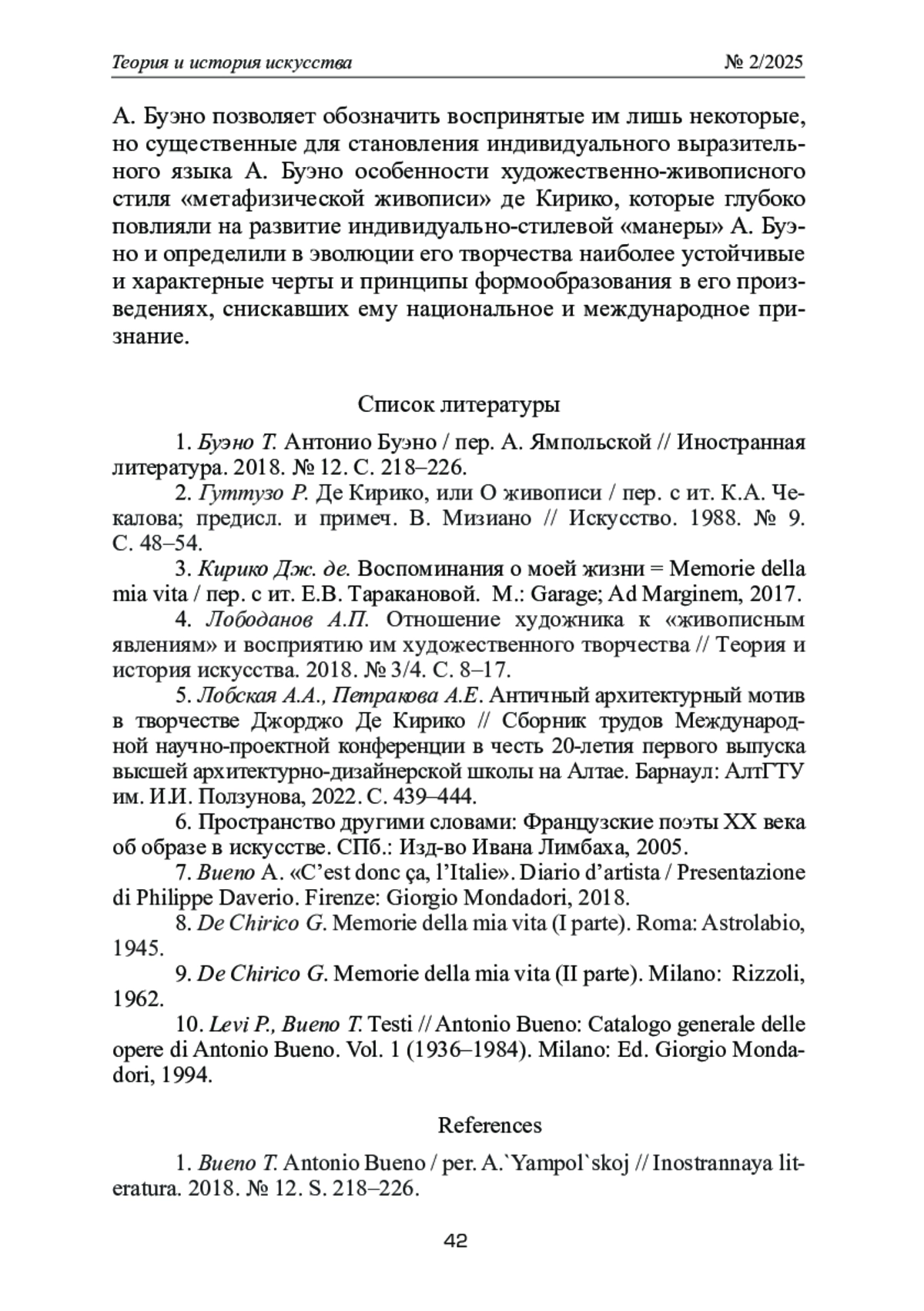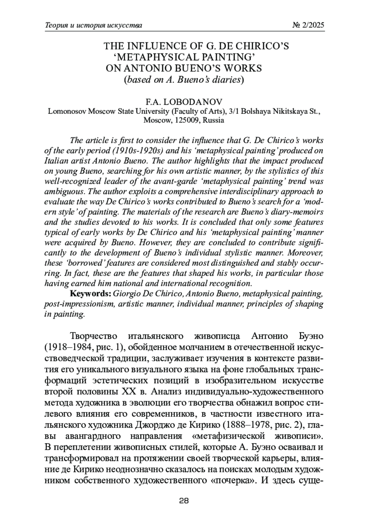 ЛОБОДАНОВ Ф. А. ВЛИЯНИЕ «МЕТАФИЗИЧЕСКОЙ ЖИВОПИСИ» ДЖ. ДЕ КИРИКО НА ТВОРЧЕСТВО АНТОНИО БУЭНО ВЛИЯНИЕ «МЕТАФИЗИЧЕСКОЙ ЖИВОПИСИ» ДЖ. ДЕ КИРИКО НА ТВОРЧЕСТВО АНТОНИО БУЭНО(ПО МАТЕРИАЛАМ ДНЕВНИКА-ВОСПОМИНАНИЙ ИТАЛЬЯНСКОГО ХУДОЖНИКА) // ТЕОРИЯ И ИСТОРИЯ ИСКУССТВА. 2025. № 2