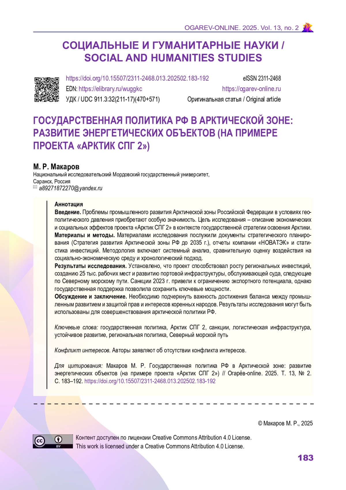 Результаты исследования. Установлено, что проект способствовал росту региональных инвестиций, созданию 25 тыс. рабочих мест и развитию портовой инфраструктуры, обслуживающей суда, следующие по Северному морскому пути. Санкции 2023 г. привели к ограничению экспортного потенциала, однако государственная поддержка позволила сохранить ключевые мощности.