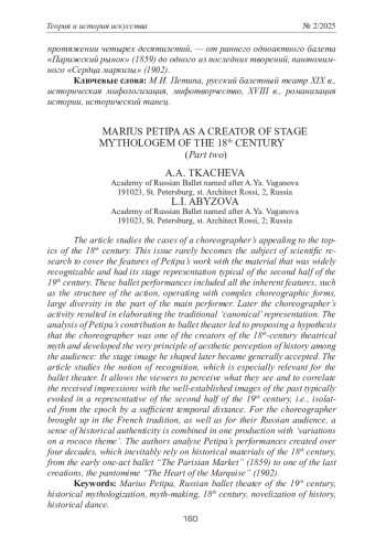 В статье рассматривается редко становящийся предметом научного исследования характер обращения балетмейстера к тематике XVIII столетия, особенности его работы с материалом в условиях узнаваемого (во многом приобретшего так называемый «канонический» облик в ходе его деятельности) сценического воплощения балетного спектакля второй половины XIX в. с присущими ему особенностями — структурой действия, оперированием сложными хореографическими формами, большим разнообразием в партии главной исполнительницы. В ходе исследования творческого наследия Петипа выявляется гипотеза о балетмейстере как об одном из создателей театрального мифа XVIII в., сформировавшем у публики его сценический образ, впоследствии становящийся общепринятым, разрабатывается сам принцип эстетического восприятия истории в зрительном зале. Исследуется особенно актуальная для балетного театра проблема узнавания, позволяющая зрителю воспринимать увиденное, соотнося полученное им впечатление от спектакля с существующим в его сознании устоявшимся обликом минувшей эпохи, характерного для человека второй половины XIX в., т. е. отделенного от рассматриваемой эпохи достаточной временной дистанцией. Для балетмейстера, воспитанного во французской традиции, так же как и для его российской публики, ощущение исторической достоверности сочетается в одной постановке с «вариациями на тему рококо». Авторами анализируются постановки Петипа, так или иначе соотносимые с историческим материалом XVIII столетия, созданные на протяжении четырех десятилетий, — от раннего одноактного балета «Парижский рынок» (1859) до одного из последних творений, пантомимного «Сердца маркизы» (1902).