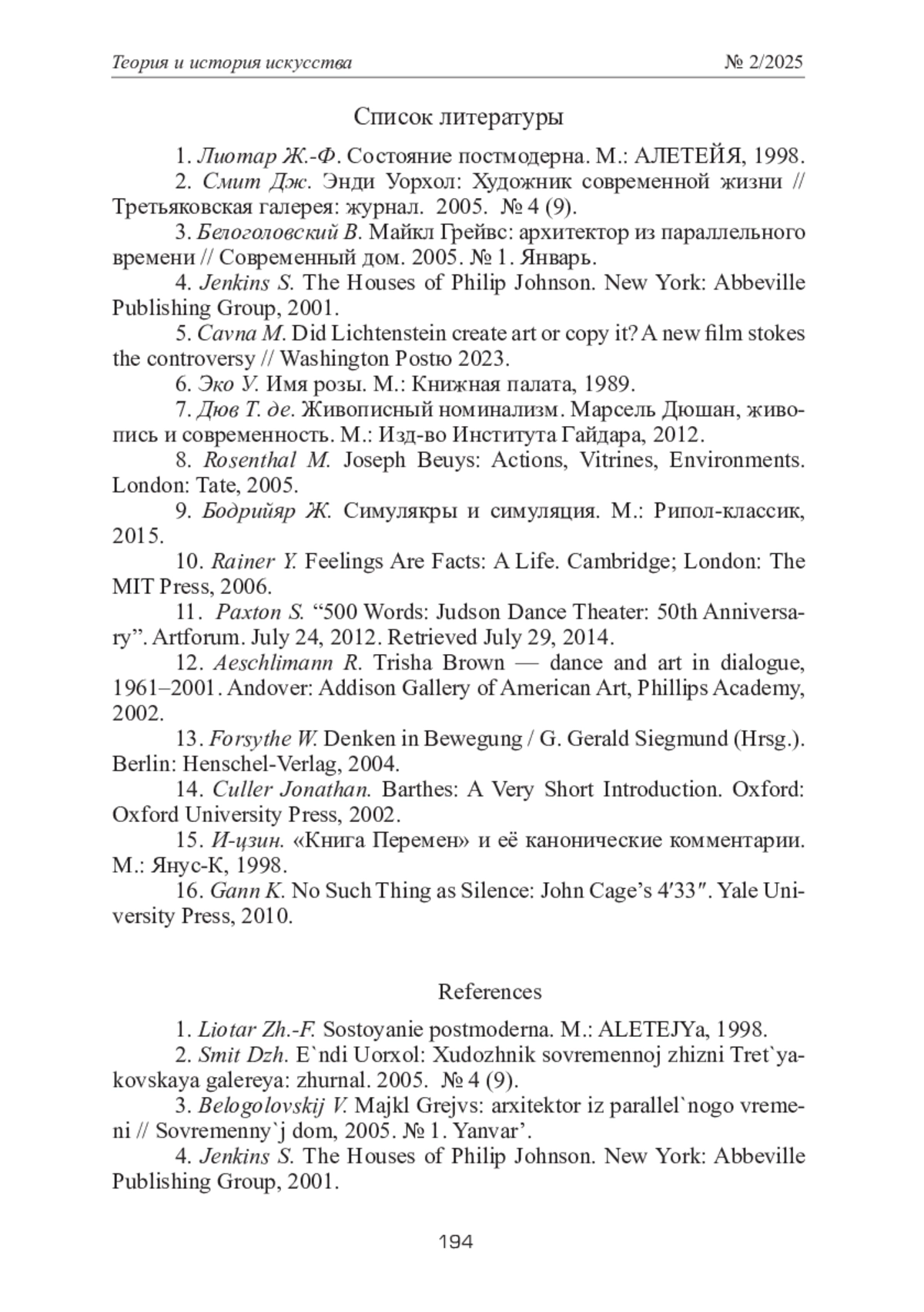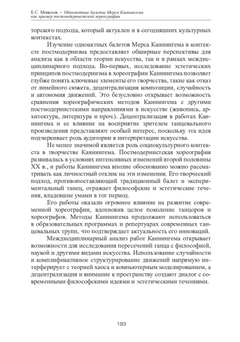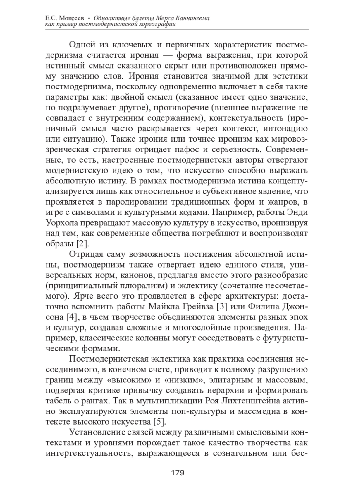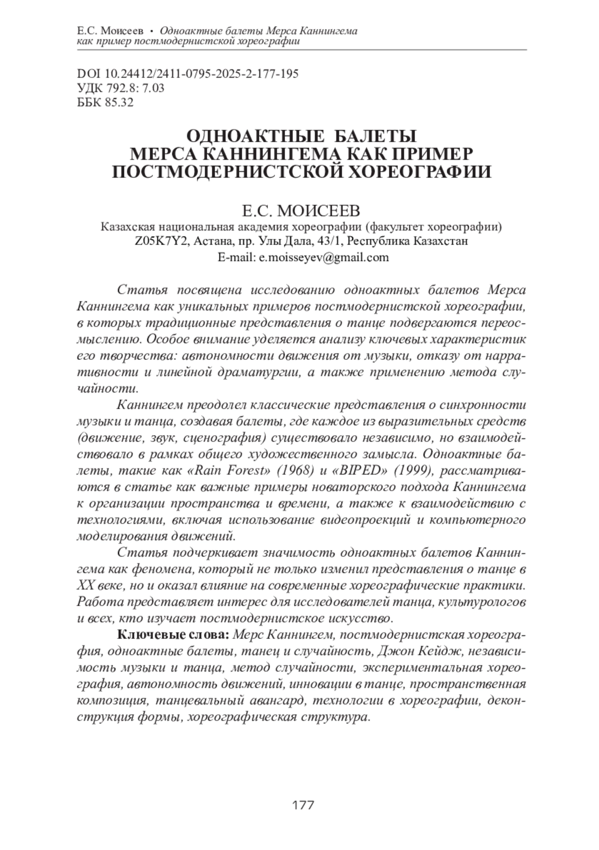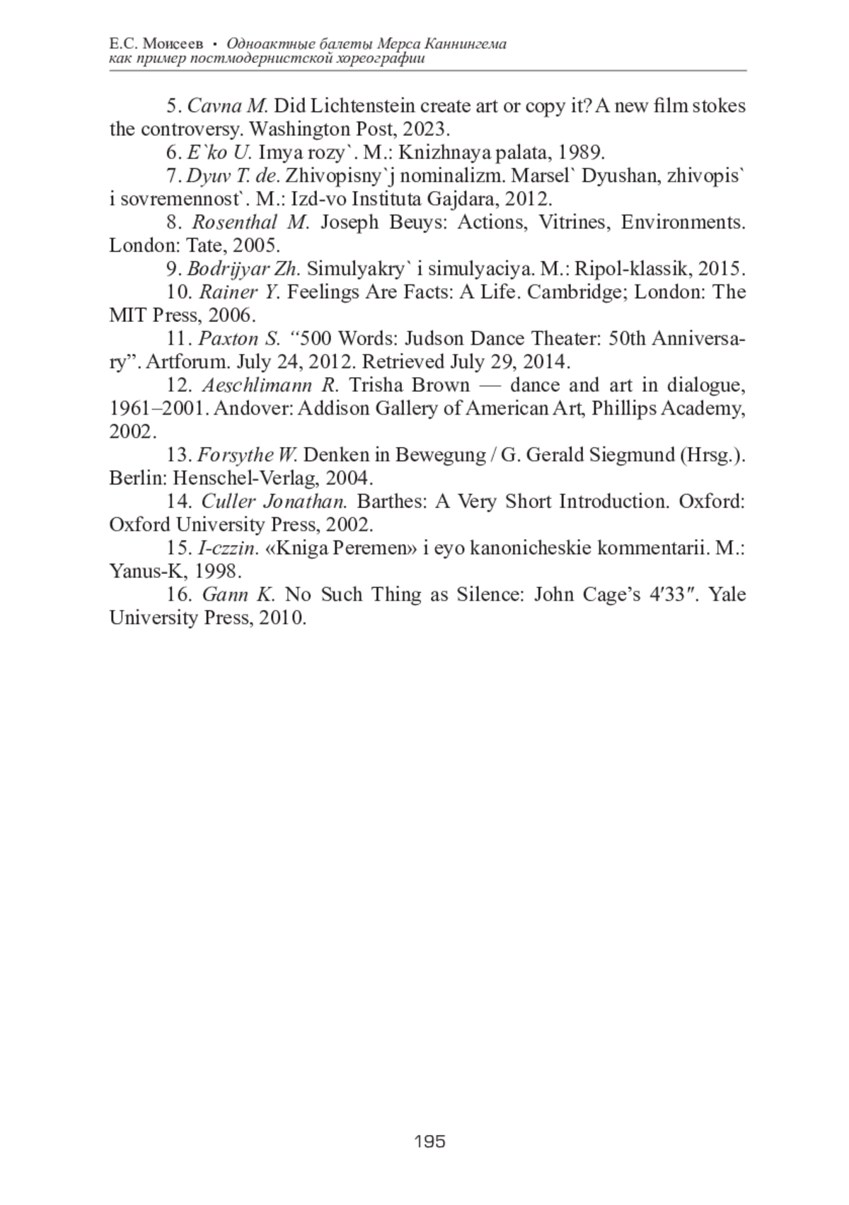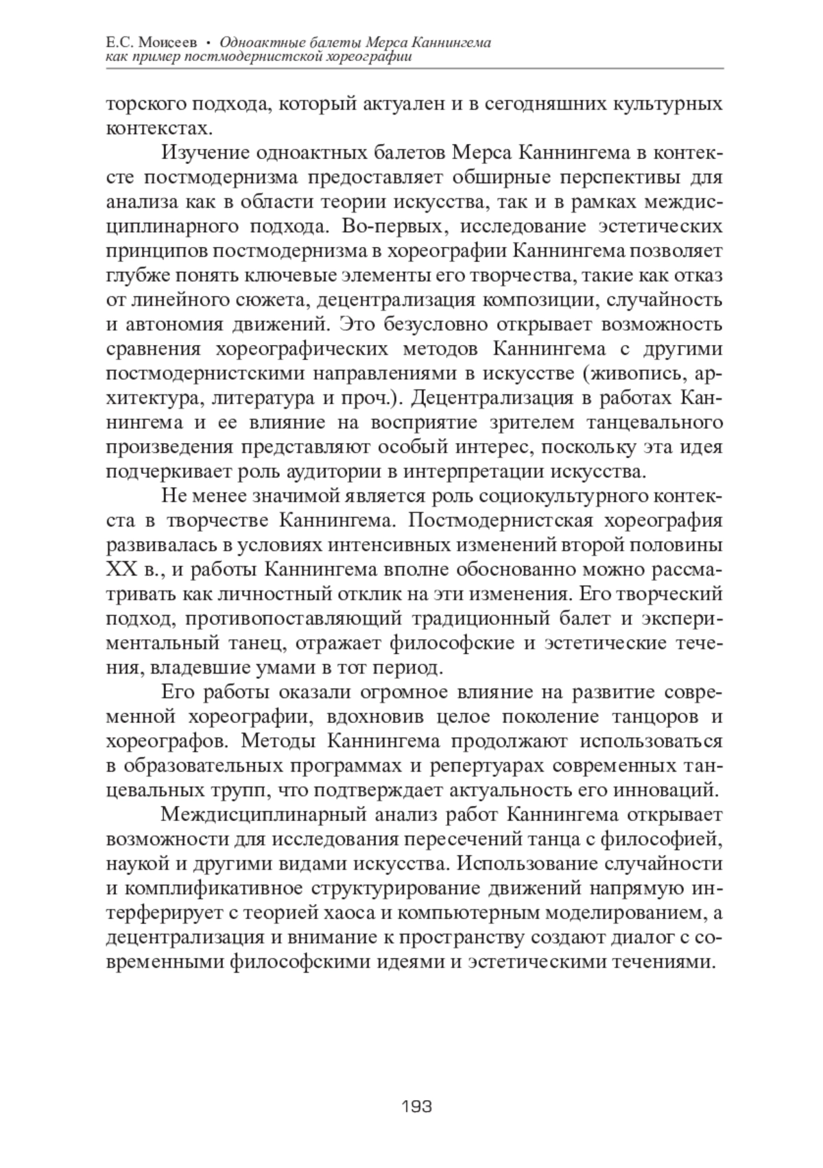 МОИСЕЕВ Е. С. ОДНОАКТНЫЕ БАЛЕТЫ МЕРСА КАННИНГЕМА КАК ПРИМЕР ПОСТМОДЕРНИСТСКОЙ ХОРЕОГРАФИИ // ТЕОРИЯ И ИСТОРИЯ ИСКУССТВА. 2025. № 2
