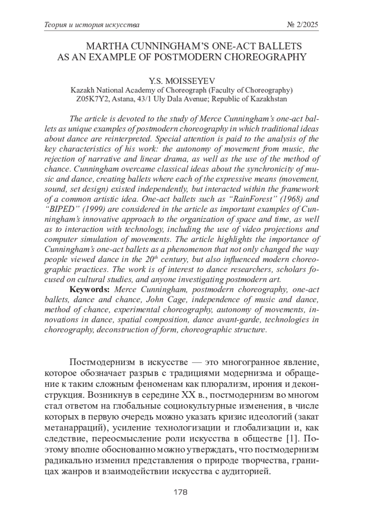 Статья: ОДНОАКТНЫЕ БАЛЕТЫ МЕРСА КАННИНГЕМА КАК ПРИМЕР ПОСТМОДЕРНИСТСКОЙ ХОРЕОГРАФИИ (2025)