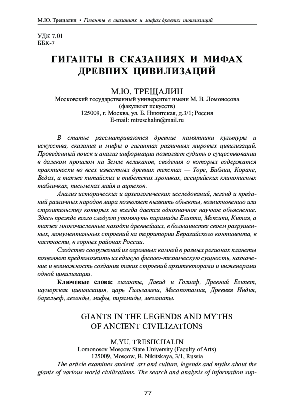 ТРЕЩАЛИН М. Ю. ГИГАНТЫ В СКАЗАНИЯХ И МИФАХ ДРЕВНИХ ЦИВИЛИЗАЦИЙ // ТЕОРИЯ И ИСТОРИЯ ИСКУССТВА. 2024. № 1-2