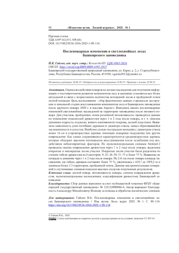 28. Zhong C., Guo M., Zhou F., Li J., Yu F., Guo F., Li W. Forest Succession Trajectories after Fires in Valleys and on Slopes in the Greater Khingan Mountains, China. Journal of Forestry Research, 2023, vol. 34, pp. 623-640. DOI: 10.1007/s11676-023-01602-9 EDN: OKKHQO