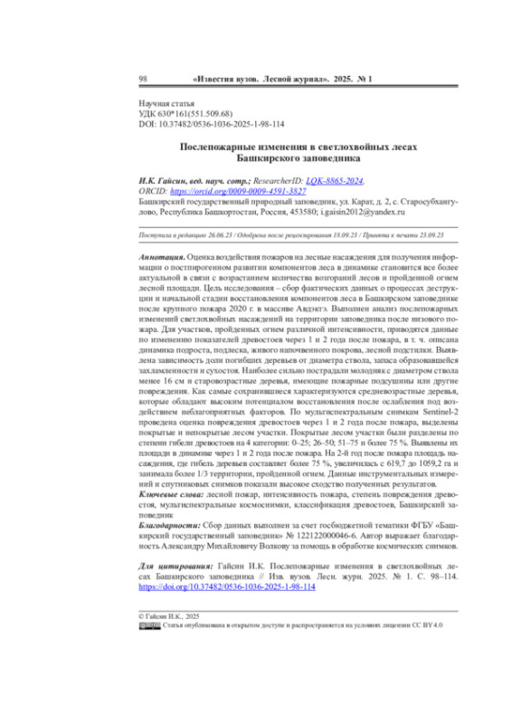 Оценка воздействия пожаров на лесные насаждения для получения информации о постпирогенном развитии компонентов леса в динамике становится все более актуальной в связи с возрастанием количества возгораний лесов и пройденной огнем лесной площади. Цель исследования - сбор фактических данных о процессах деструкции и начальной стадии восстановления компонентов леса в Башкирском заповеднике после крупного пожара 2020 г. в массиве Авдэктэ. Выполнен анализ послепожарных изменений светлохвойных насаждений на территории заповедника после низового пожара. Для участков, пройденных огнем различной интенсивности, приводятся данные по изменению показателей древостоев через 1 и 2 года после пожара, в т. ч. описана динамика подроста, подлеска, живого напочвенного покрова, лесной подстилки. Выявлена зависимость доли погибших деревьев от диаметра ствола, запаса образовавшейся захламленности и сухостоя. Наиболее сильно пострадали молодняк с диаметром ствола менее 16 см и старовозрастные деревья, имеющие пожарные подсушины или другие повреждения. Как самые сохранившиеся характеризуются средневозрастные деревья, которые обладают высоким потенциалом восстановления после ослабления под воздействием неблагоприятных факторов. По мультиспектральным снимкам Sentinel-2 проведена оценка повреждения древостоев через 1 и 2 года после пожара, выделены покрытые и непокрытые лесом участки. Покрытые лесом участки были разделены по степени гибели древостоев на 4 категории: 0-25; 26-50; 51-75 и более 75 %. Выявлены их площади в динамике через 1 и 2 года после пожара. На 2-й год после пожара площадь насаждения, где гибель деревьев составляет более 75 %, увеличилась с 619,7 до 1059,2 га и занимала более 1/3 территории, пройденной огнем. Данные инструментальных измерений и спутниковых снимков показали высокое сходство полученных результатов.