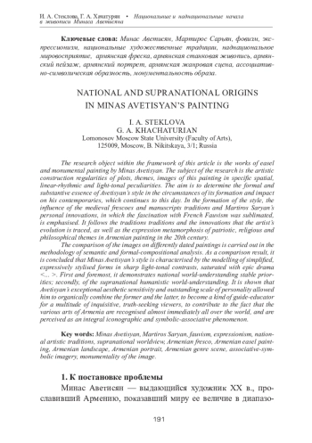 Объектом исследования в рамках настоящей статьи являются произведения станковой и монументальной живописи Минаса Аветисяна. В качестве предмета исследования рассматриваются закономерности художественного конструирования сюжетов, тем, образов этой живописи в конкретных пространственных, линейно-ритмических и светотональных особенностях. Цель — определить формально-содержательную сущность авторского стиля Аветисяна в обстоятельствах становления и воздействия на современников, которое продолжается до сих пор. В становлении стиля подчеркивается влияние традиций средневековых фресок и манускриптов и персональных новаций Мартироса Сарьяна, в которых сублимировано увлечение французским фовизмом. Именно в диалоге с этими традициями и с этими новациями прослеживается эволюция художника, а также метаморфозы выражения патриотической, религиозной, философской тематики в армянской живописи XX в. Сравнение живописных образов разного времени осуществляется в методологии семантического и формально-композиционного анализа. В результате сравнения делается вывод о том, что стиль Минаса Аветисяна характеризует моделировка упрощенных, экспрессивно стилизованных форм в резких светотональных контрастах, насыщенных эпическим драматизмом; и это демонстрация, во-первых, устойчивых приоритетов национального миропонимания; во-вторых, наднационального гуманистического миропонимания. Показывается, что исключительная эстетическая чуткость и незаурядный масштаб личности позволили Аветисяну органически совместить первое и второе, стать своего рода проводником-просветителем для множества пытливых, страждущих истины зрителей, способствовать тому, что разнообразное искусство Армении узнается практически сразу же по всему свету, воспринимается как целостный иконографический и символико-ассоциативный феномен.