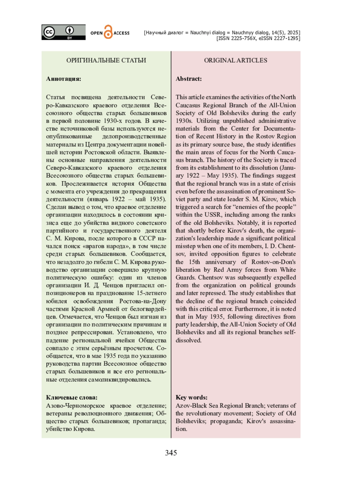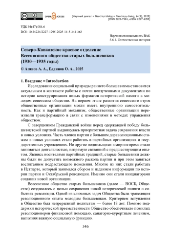 Статья посвящена деятельности Северо-Кавказского краевого отделения Все союзного общества старых большевиков в первой половине 1930-х годов. В качестве источниковой базы используются не опубликованные делопроизводственные материалы из Центра документации новей шей истории Ростовской области. Выявлены основные направления деятельности Северо-Кавказского краевого отделения Всесоюзного общества старых большевиков. Прослеживается история Общества с момента его учреждения до прекращения деятельности (январь 1922 – май 1935). Сделан вывод о том, что краевое отделение организации находилось в состоянии кризиса еще до убийства видного советского партийного и государственного деятеля С. М. Кирова, после которого в СССР начался поиск «врагов народа», в том числе среди старых большевиков. Сообщается, что незадолго до гибели С. М. Кирова руководство организации совершило крупную политическую ошибку: один из членов организации И. Д. Ченцов пригласил оп позиционеров на празднование 15-летнего юбилея освобождения Ростова-на-Дону частями Красной Армией от белогвардейцев. Отмечается, что Ченцов был изгнан из организации по политическим причинам и позднее репрессирован. Установлено, что падение региональной ячейки Общества совпало с этим серьёзным просчетом. Со общается, что в мае 1935 года по указанию руководства партии Всесоюзное общество старых большевиков и все его региональные отделения самоликвидировались.