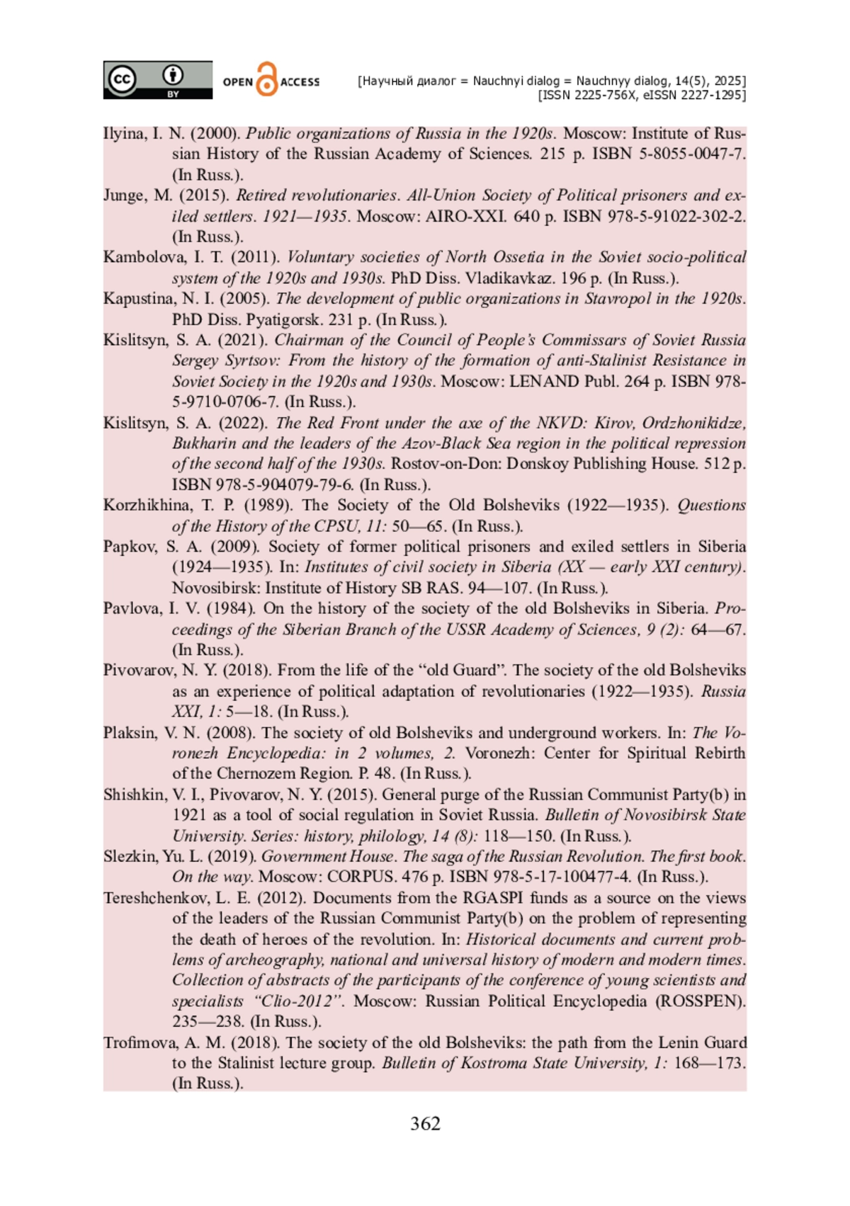 15. Пивоваров Н. Ю. Из жизни «старой гвардии». Общество старых большевиков как опыт политической адаптации революционеров (1922-1935 гг.) / Н. Ю. Пивоваров // Россия XXI. - 2018. - № 1. - С. 5-18.