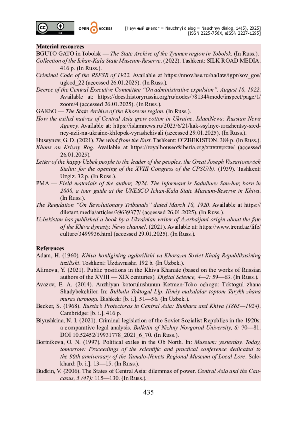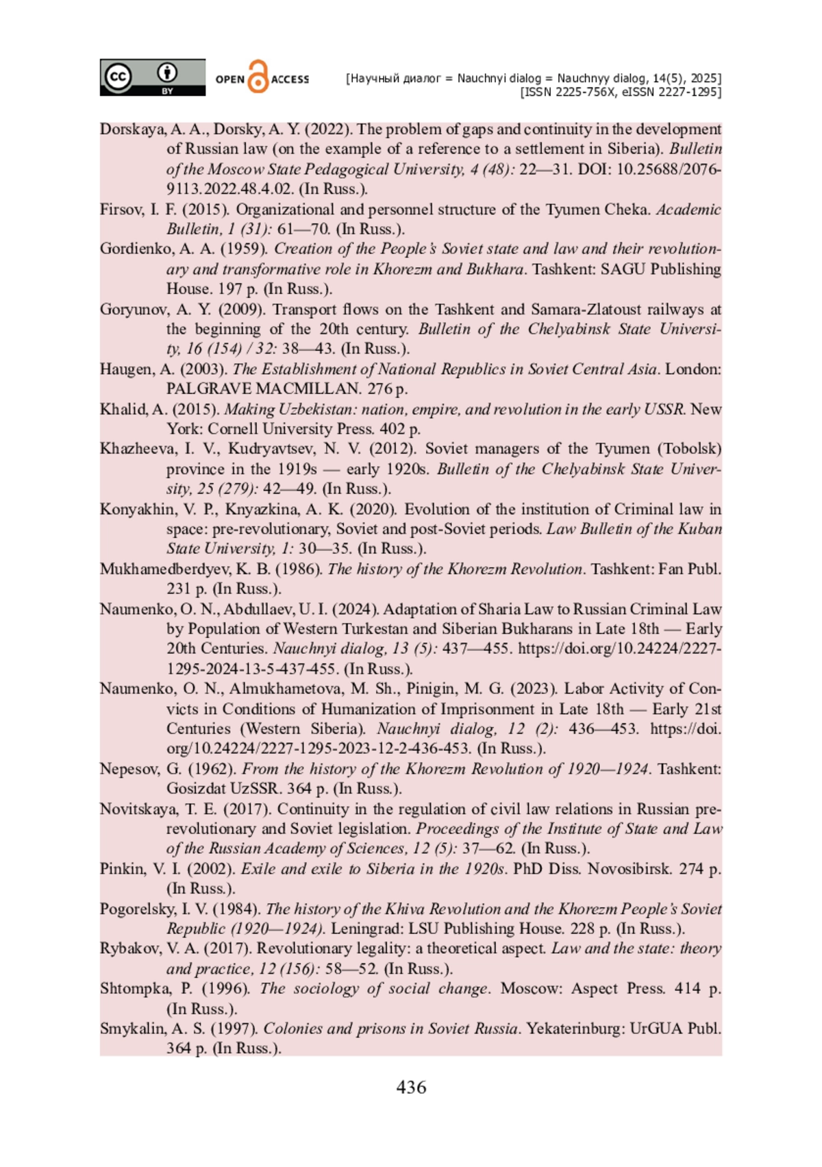 12. Науменко О. Н. Адаптация шариата к российскому уголовному праву у населения Западного Туркестана и сибирских бухарцев в конце XVIII - начале ХХ веков / О. Н. Науменко, У. И. Абдуллаев // Научный диалог. - 2024. - Т. 13. - № 5. - С. 437- 455. - https://doi.org/10.24224/2227-1295-2024-13-5-437-455.