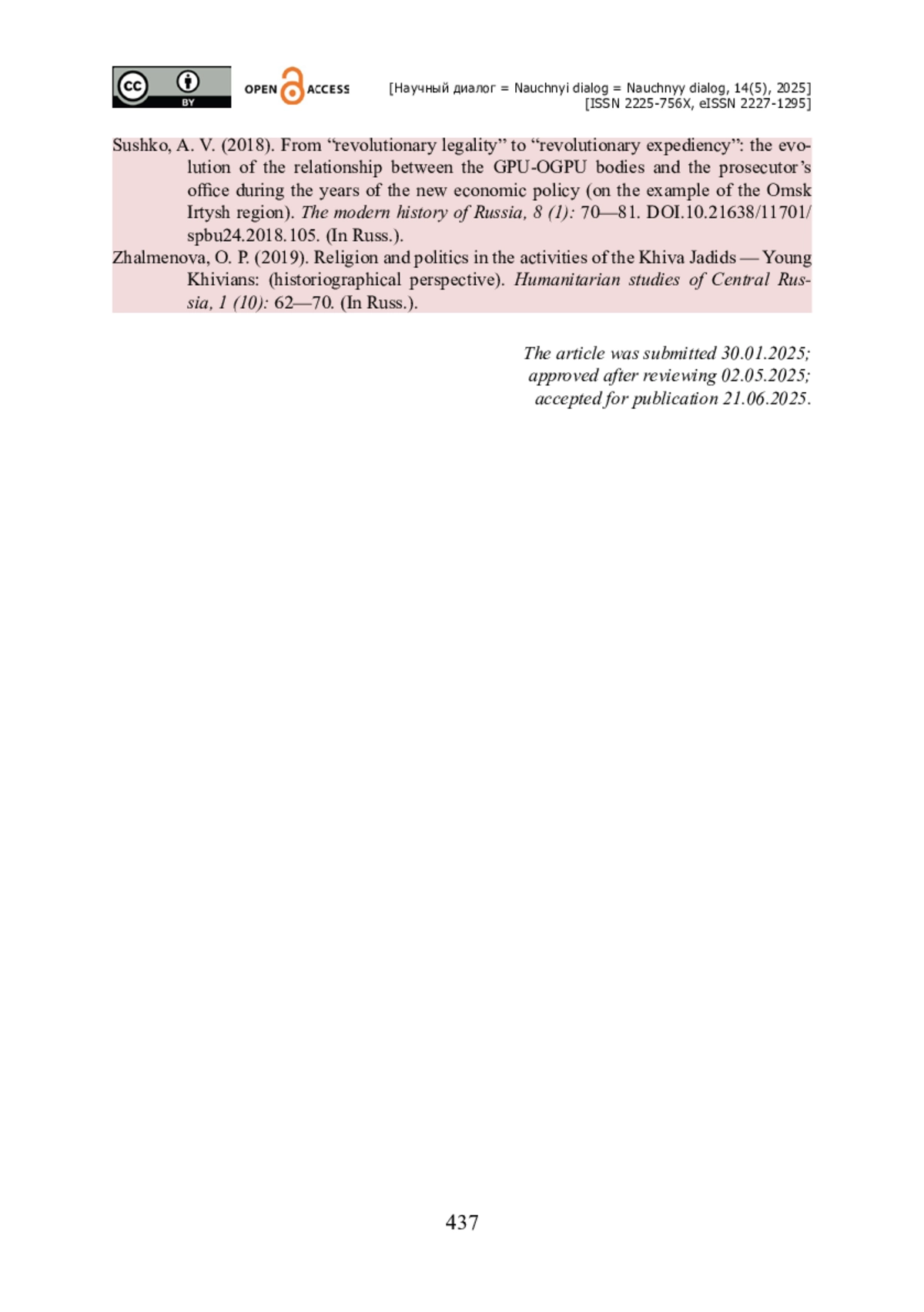 8. Жалменова О. П. Религия и политика в деятельности хивинских джадидов - младохивинцев : (историографический ракурс) / О. П. Жалменова // Гуманитарные исследования Центральной России. - 2019. - № 1 (10). - 2019. - С. 62-70.