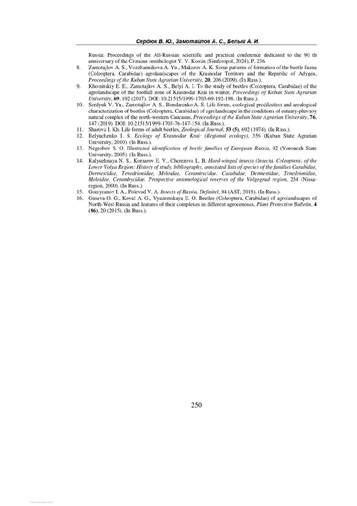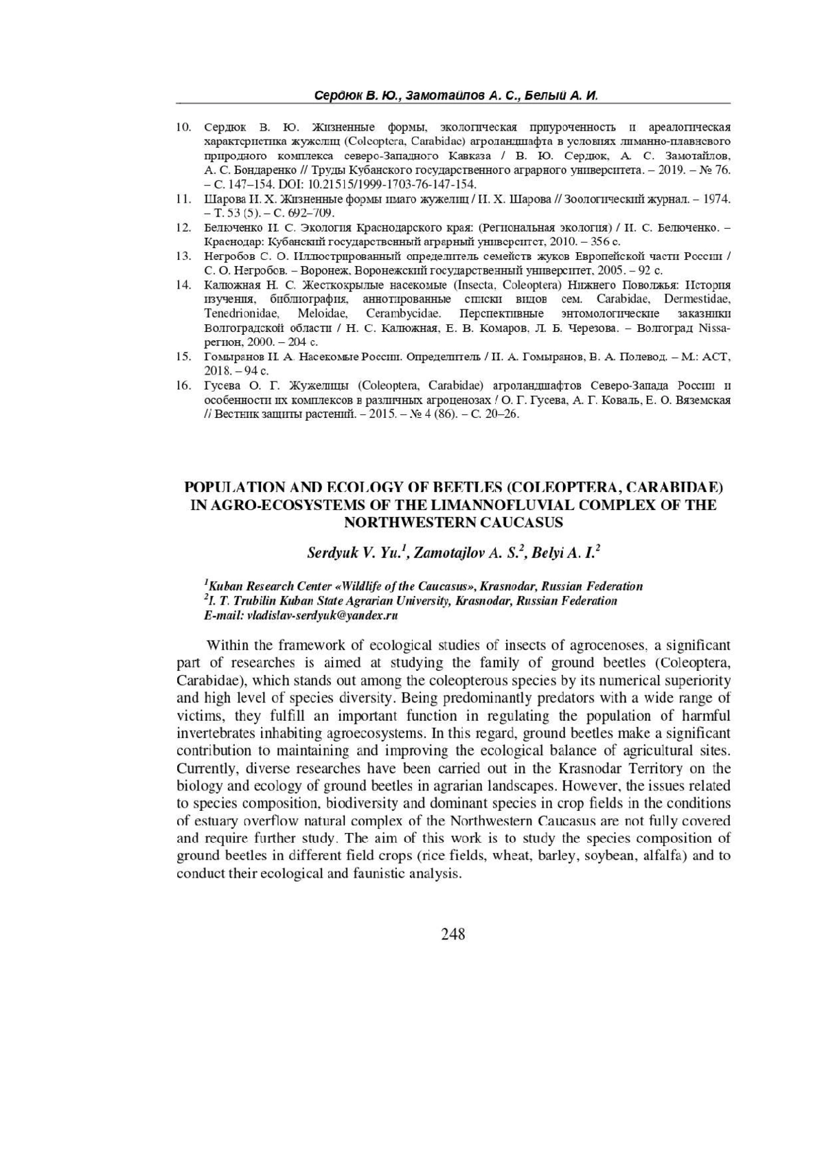 Проведен эколого-фаунистический анализ жуков-жужелиц (Coleoptera, Carabidae) в агроценозах Краснодарского края, направленный на изучение видового состава, распределения и экологических особенностей этих насекомых в условиях сельскохозяйственных ландшафтов региона. Установлен видовой состав карабид на полях озимой пшеницы, озимого ячменя, сои, люцерны 2-го года и рисовых полях. Всего обнаружен 51 вид жуков из 28 родов и 16 триб. Наибольшее видовое разнообразие отмечено на полях пшеницы (38 видов) и ячменя (24 вида). Выявлено 23 доминирующих вида жужелиц, среди которых: Carabus exaratus, C. cumanus, C. campestris, Brachinus crepitans, Poecilus cupreus, Pterostichus niger, Calathus distinguendus, C. fuscipes, C. erratus, C. halensis, C. melanocephalus, Amara aenea, A. lucida, Zabrus tenebrioides, Harpalus distinguendus, H. rufipes, H. tardus, H. affinis, Ophonus azureus, Callistus lunatus, Dinodes decipiens, Chlaenius aeneocephalus, Ch. nitidulus. По гигропреферендуму Carabidae в исследуемом районе относятся к мезофилам, мезо-ксерофилам, мезогигрофилам и гигрофилам. В спектре жизненных форм жужелиц основную массу составляли миксофитофаги геохортобионты гарпалоидные и зоофаги стратобионты-скважники поверхностно-подстилочные, стратобионты зарывающиеся подстилочно-почвенные, стратобионты-скважники подстилочные. Установлена степень сходства видового состава жужелиц, между полями сельскохозяйственных культур.