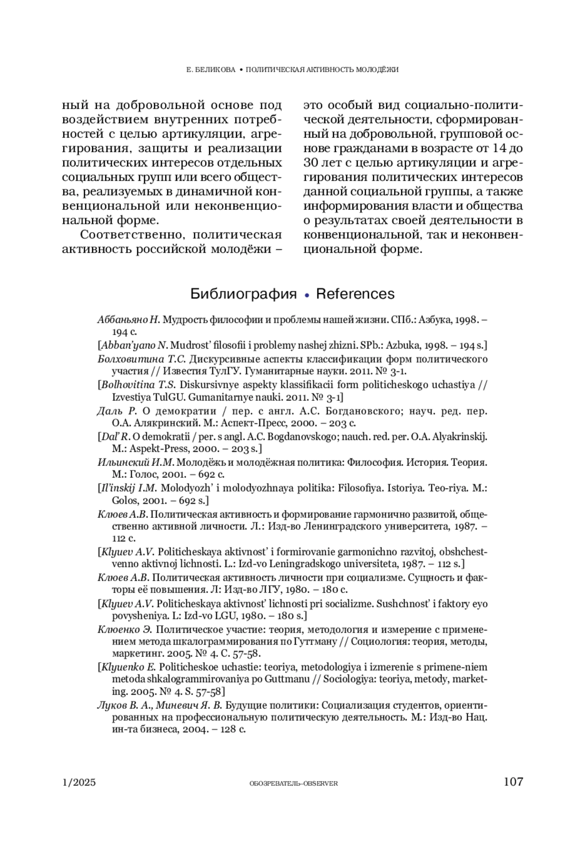 БЕЛИКОВА Е. А. ПОЛИТИЧЕСКАЯ АКТИВНОСТЬ МОЛОДЁЖИ. ПОНЯТИЕ, СОДЕРЖАНИЕ, ОСОБЕННОСТИ ЭЛЕКТОРАЛЬНОГО ПОВЕДЕНИЯ // ОБОЗРЕВАТЕЛЬ. 2025. № 1