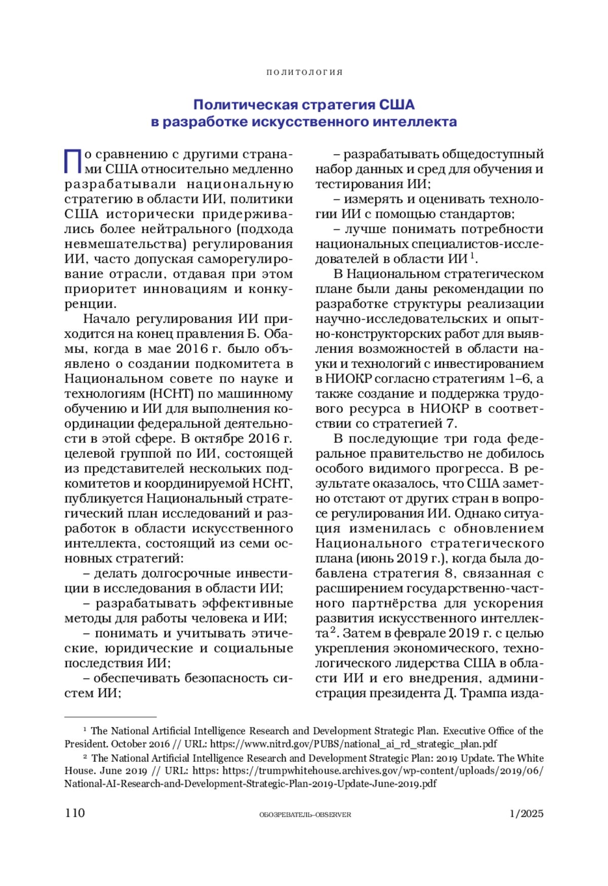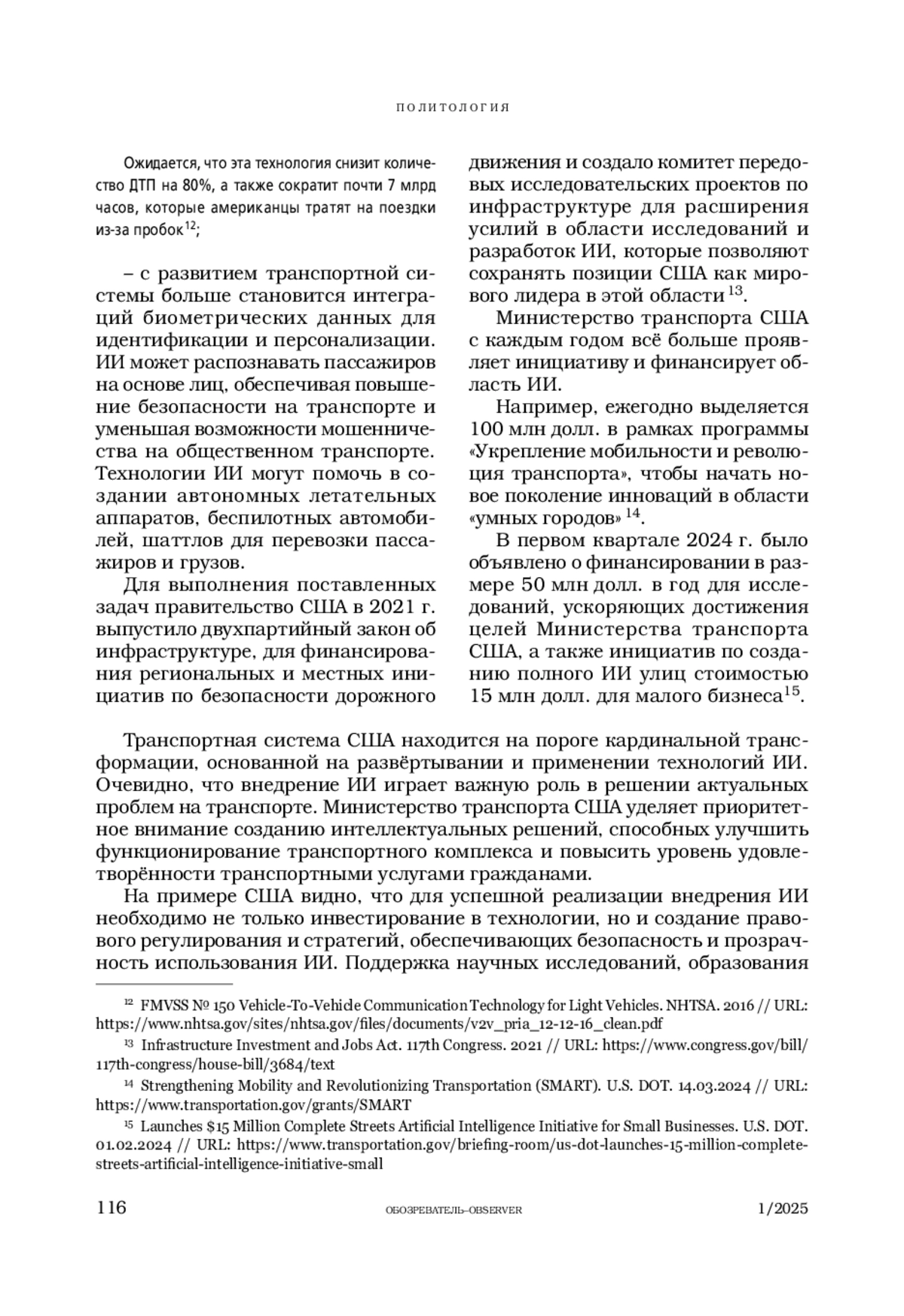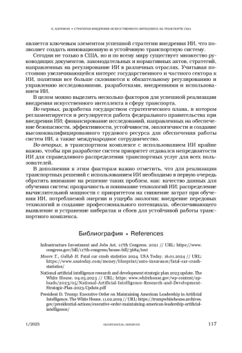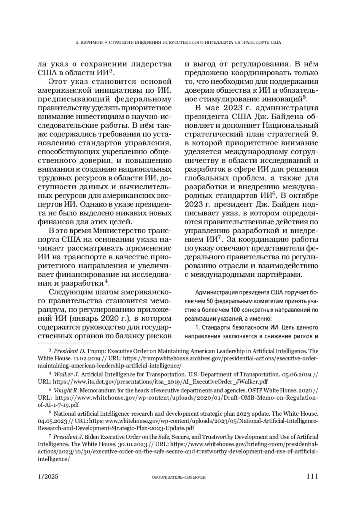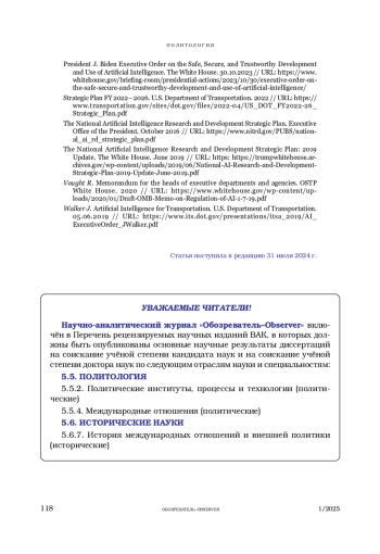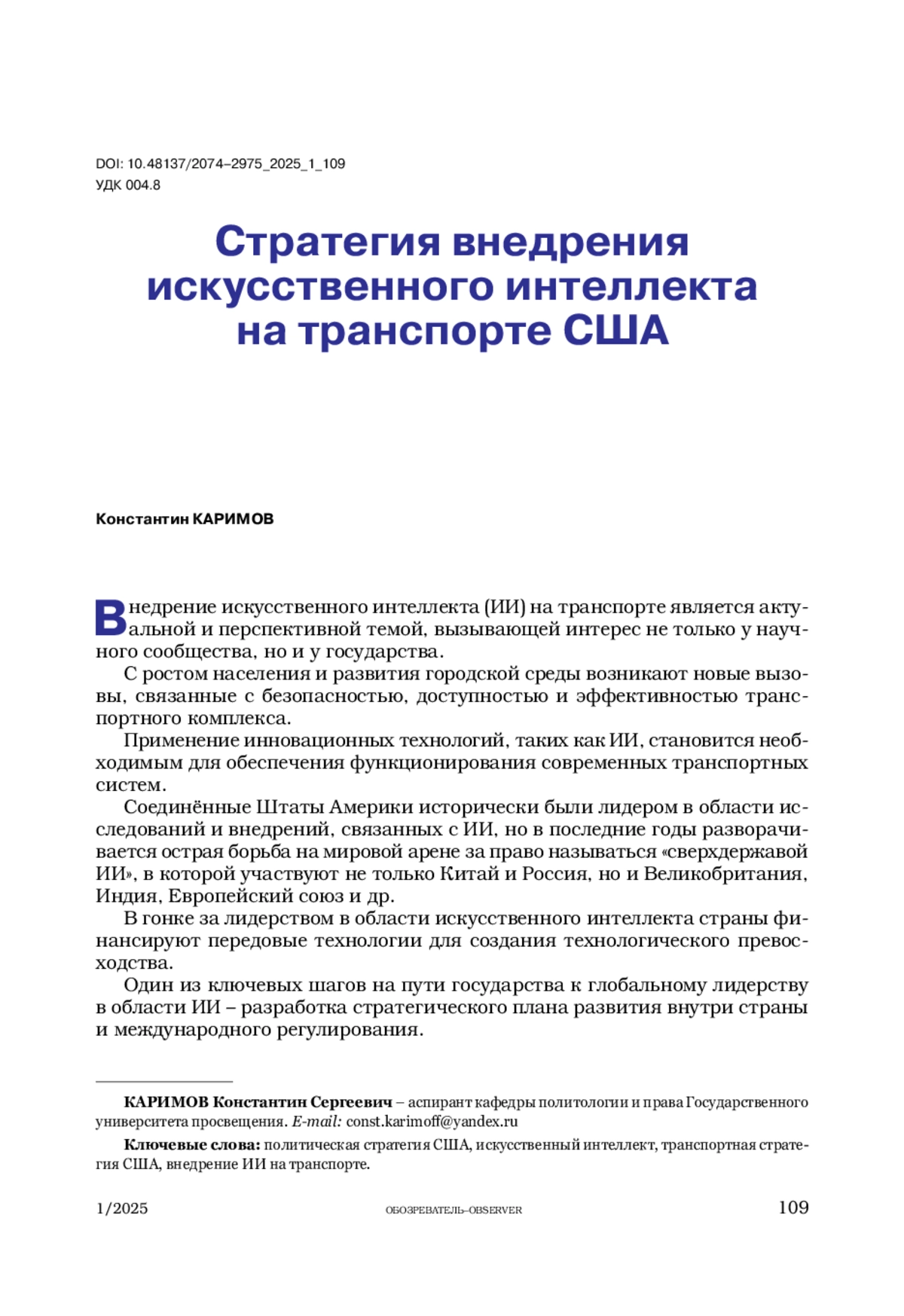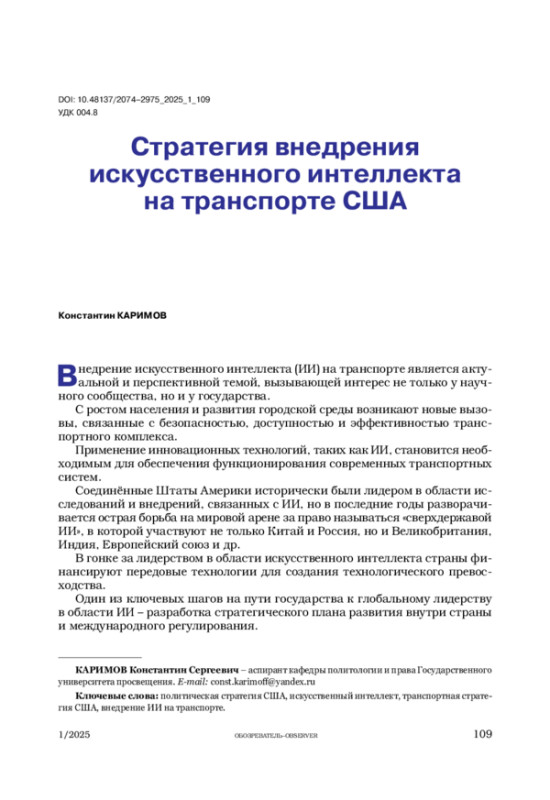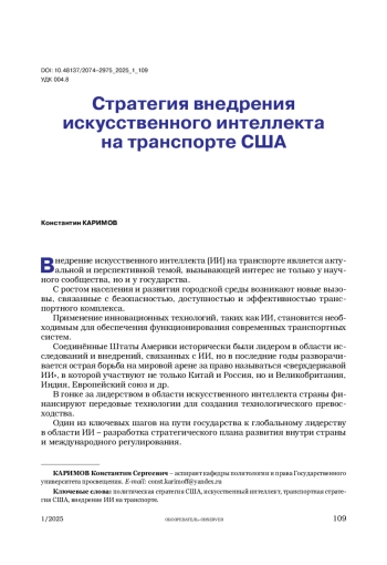 КАРИМОВ К. С. СТРАТЕГИЯ ВНЕДРЕНИЯ ИСКУССТВЕННОГО ИНТЕЛЛЕКТА НА ТРАНСПОРТЕ США // ОБОЗРЕВАТЕЛЬ. 2025. № 1