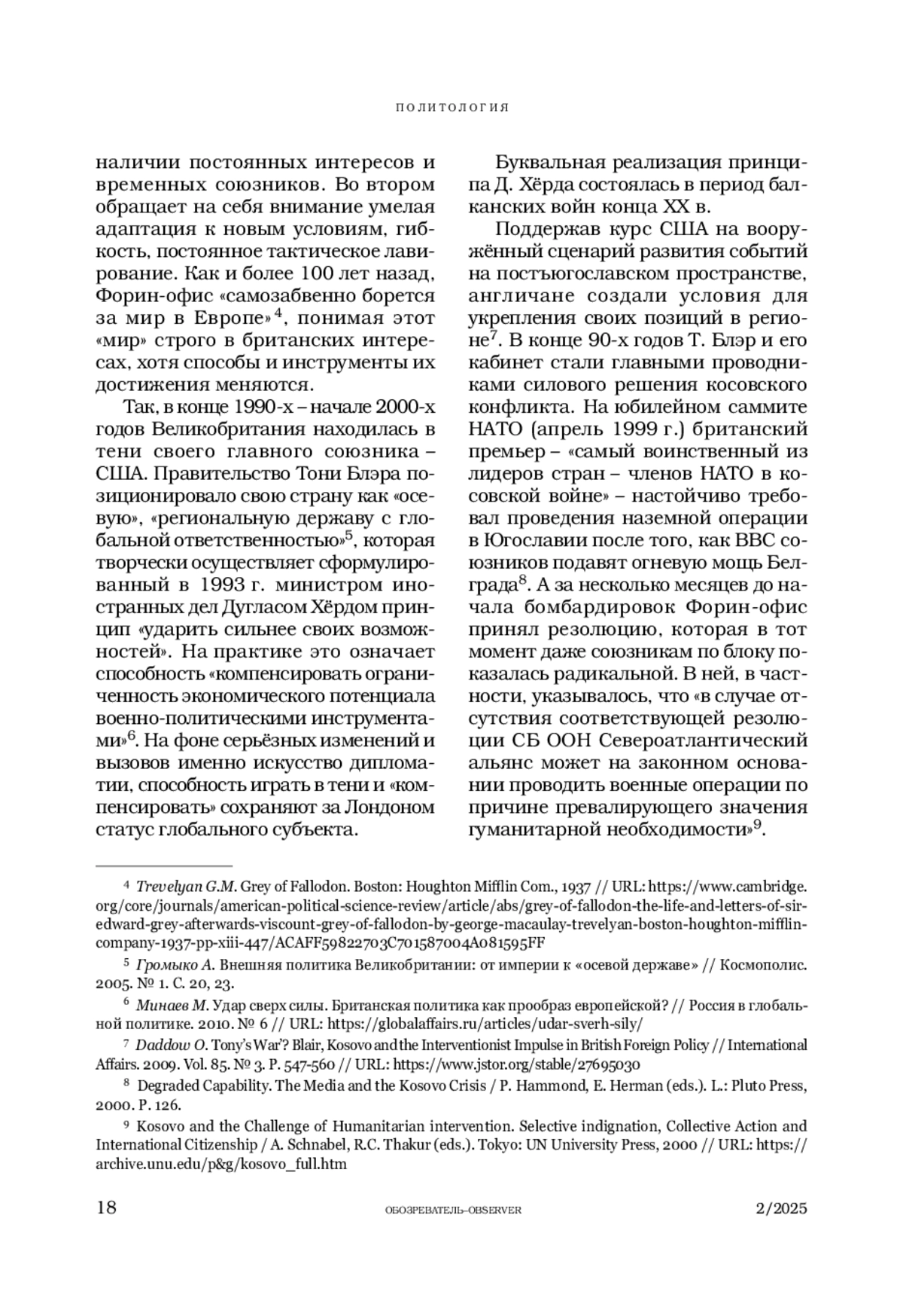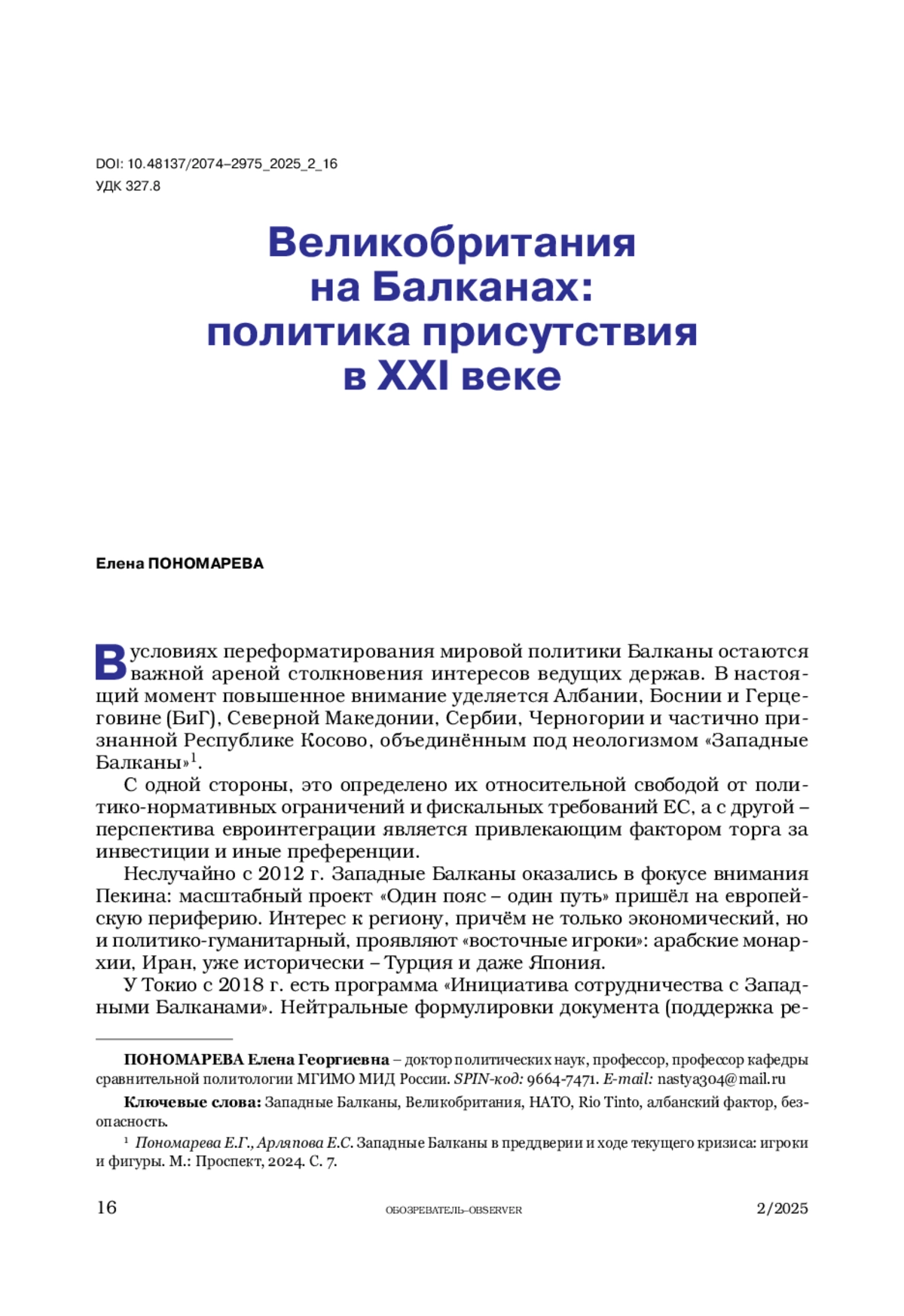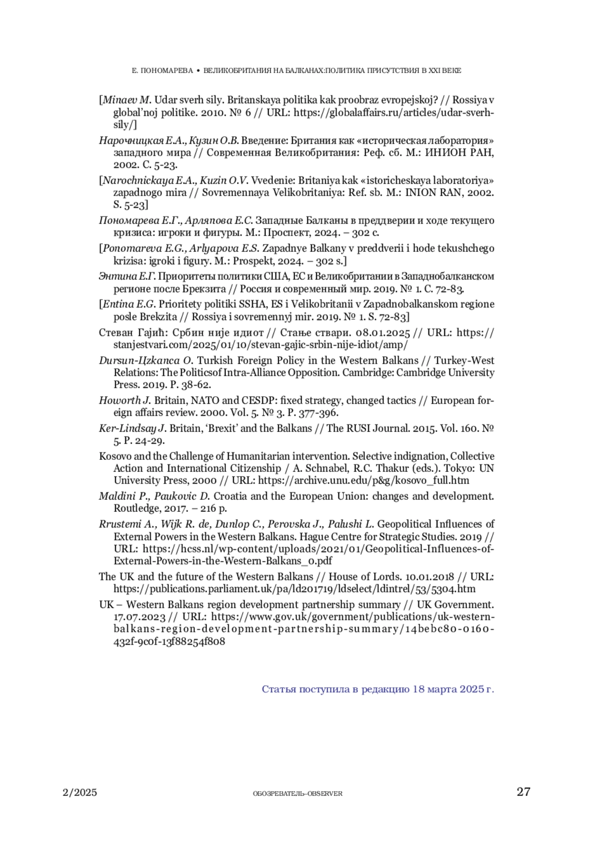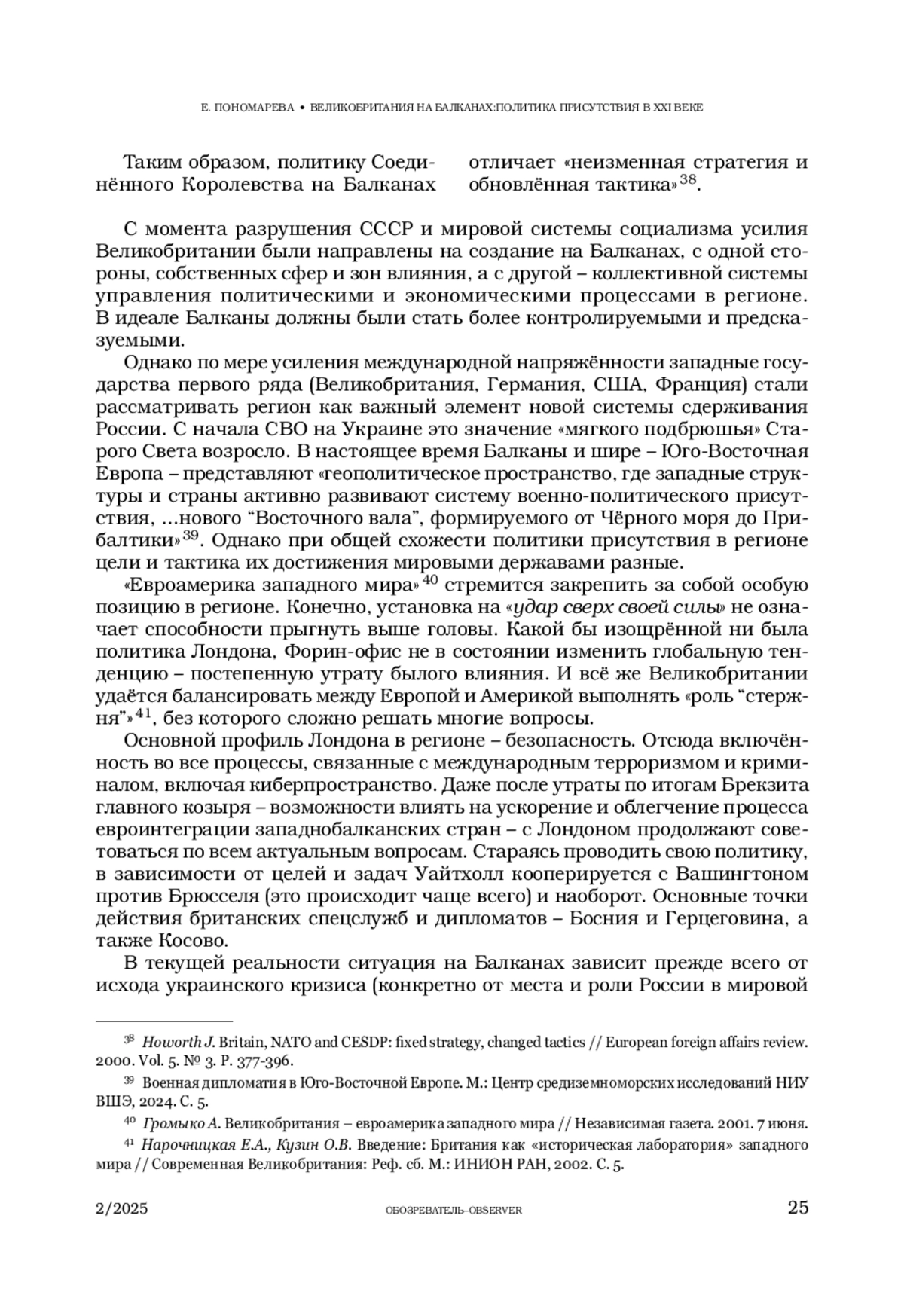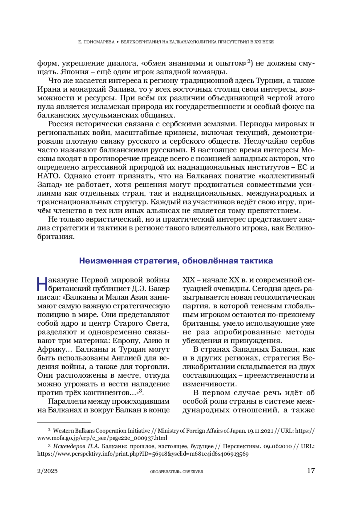 ПОНОМАРЕВА Е. Г. ВЕЛИКОБРИТАНИЯ НА БАЛКАНАХ: ПОЛИТИКА ПРИСУТСТВИЯ В XXI ВЕКЕ // ОБОЗРЕВАТЕЛЬ. 2025. № 2