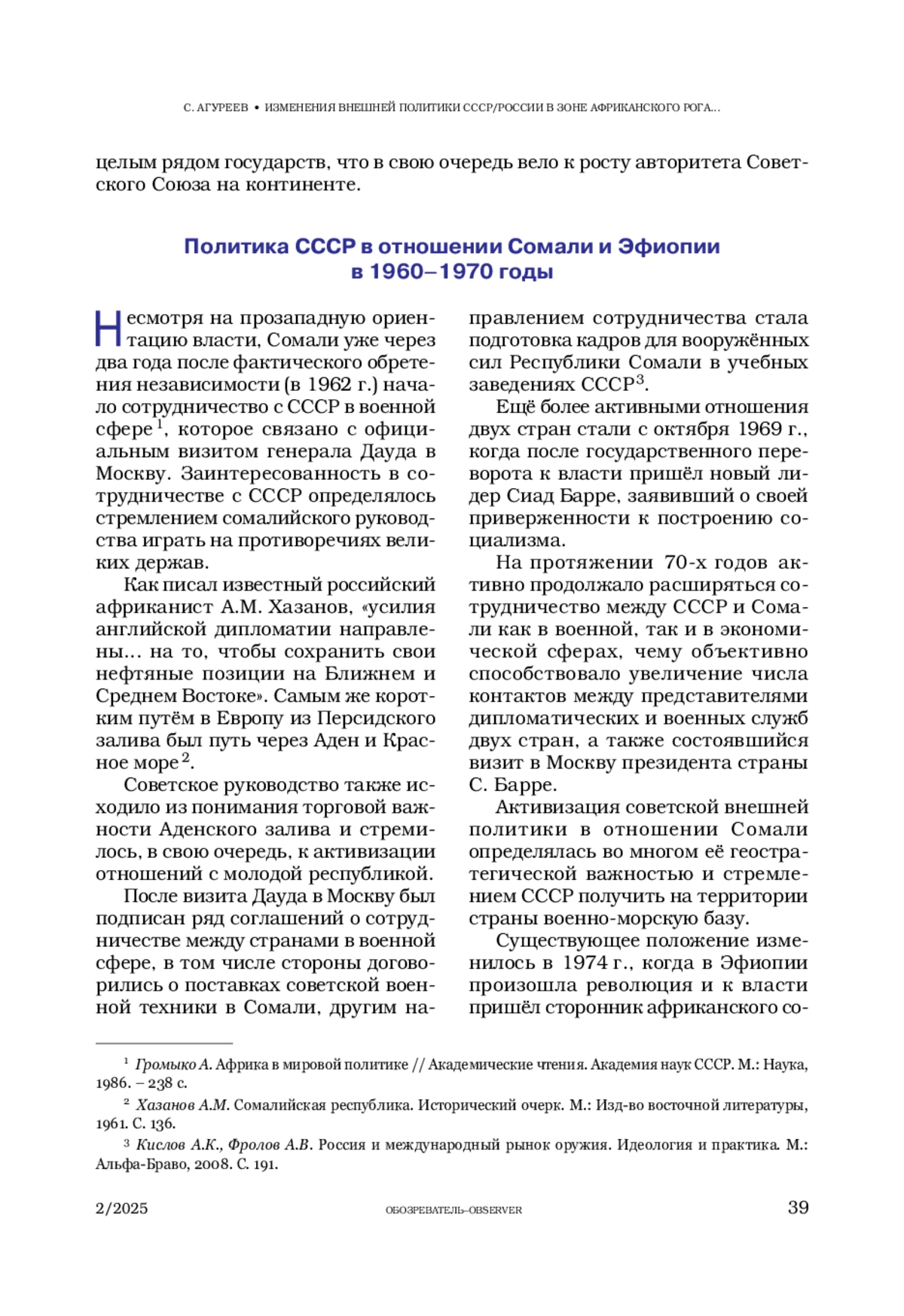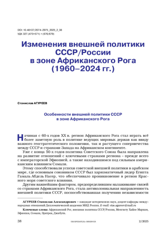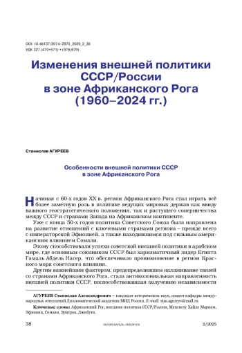 Автор рассматривает трансформацию внешней политики СССР/ России в зоне Африканского Рога начиная с 60-х годов. Причинами изменения внешнеполитических подходов СССР/России являлось не только развитие политической ситуации в регионе, но и смена политического вектора в СССР/России.
