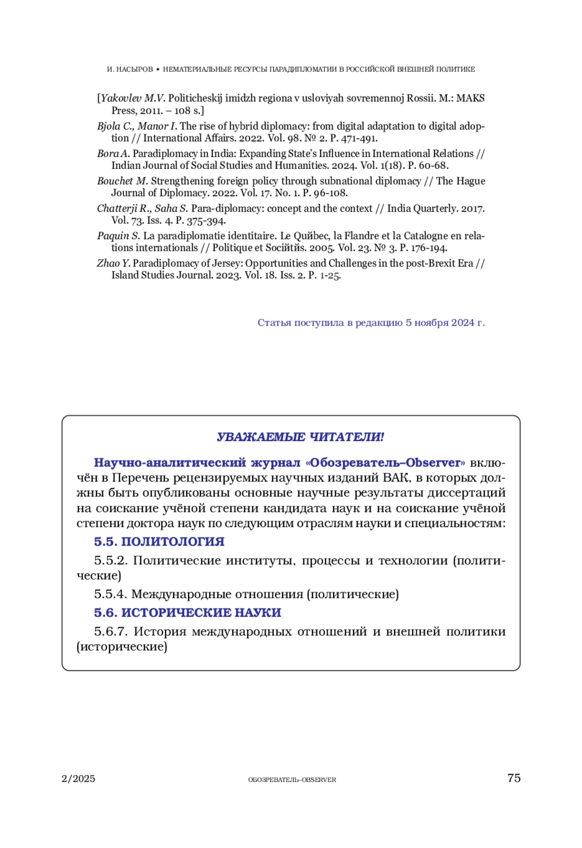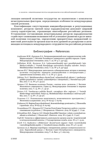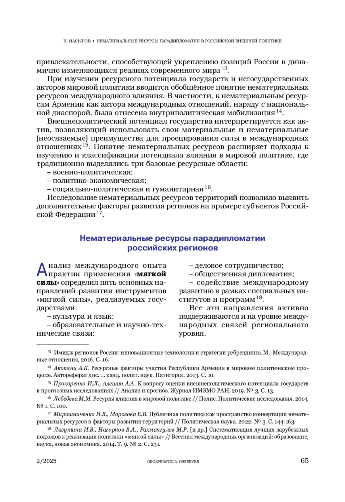 3. Артеев С.П. Внешняя политика России: «мягкая сила» регионов. // Вестник Московского университета. Серия 25. Международные отношения и мировая политика. 2021. Т. 13. № 1. С. 32-57.