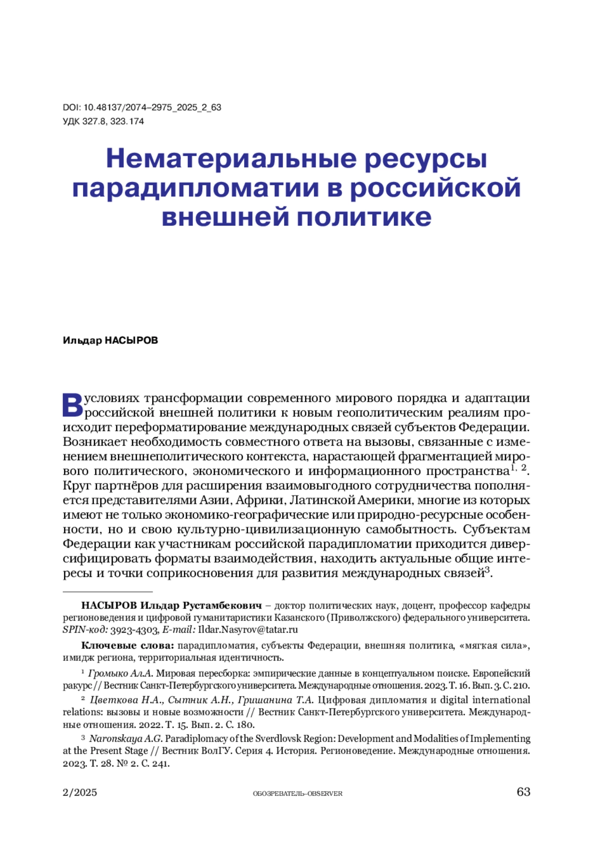 Развивая международные и внешнеэкономические связи, субъекты Федерации участвуют в реализации российской внешней политики. Применение понятия «нематериальные ресурсы» парадипломатии позволило расширить потенциал регионов по укреплению международных связей и достижению целей российской внешней политики.