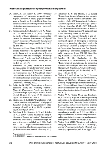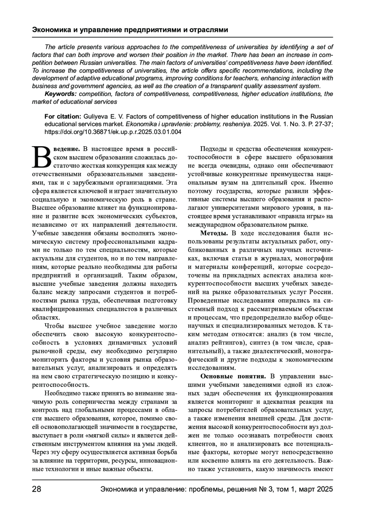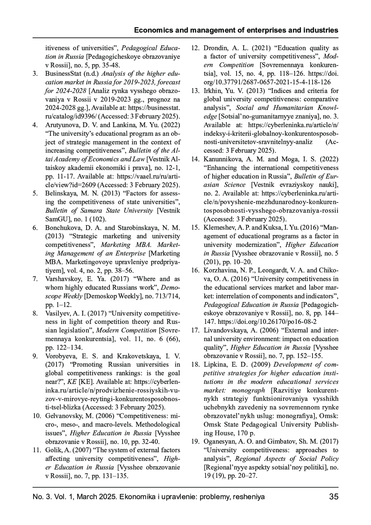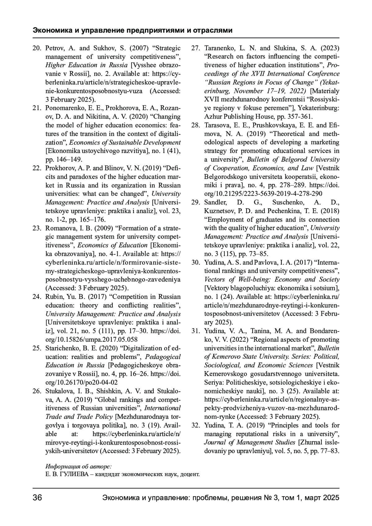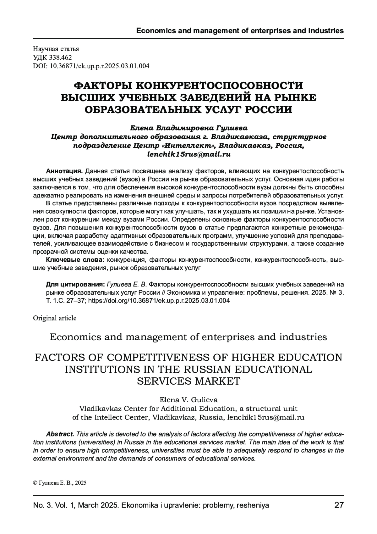 ГУЛИЕВА Е. В. ФАКТОРЫ КОНКУРЕНТОСПОСОБНОСТИ ВЫСШИХ УЧЕБНЫХ ЗАВЕДЕНИЙ НА РЫНКЕ ОБРАЗОВАТЕЛЬНЫХ УСЛУГ РОССИИ // ЭКОНОМИКА И УПРАВЛЕНИЕ: ПРОБЛЕМЫ, РЕШЕНИЯ. 2025. ТОМ 1 № 3