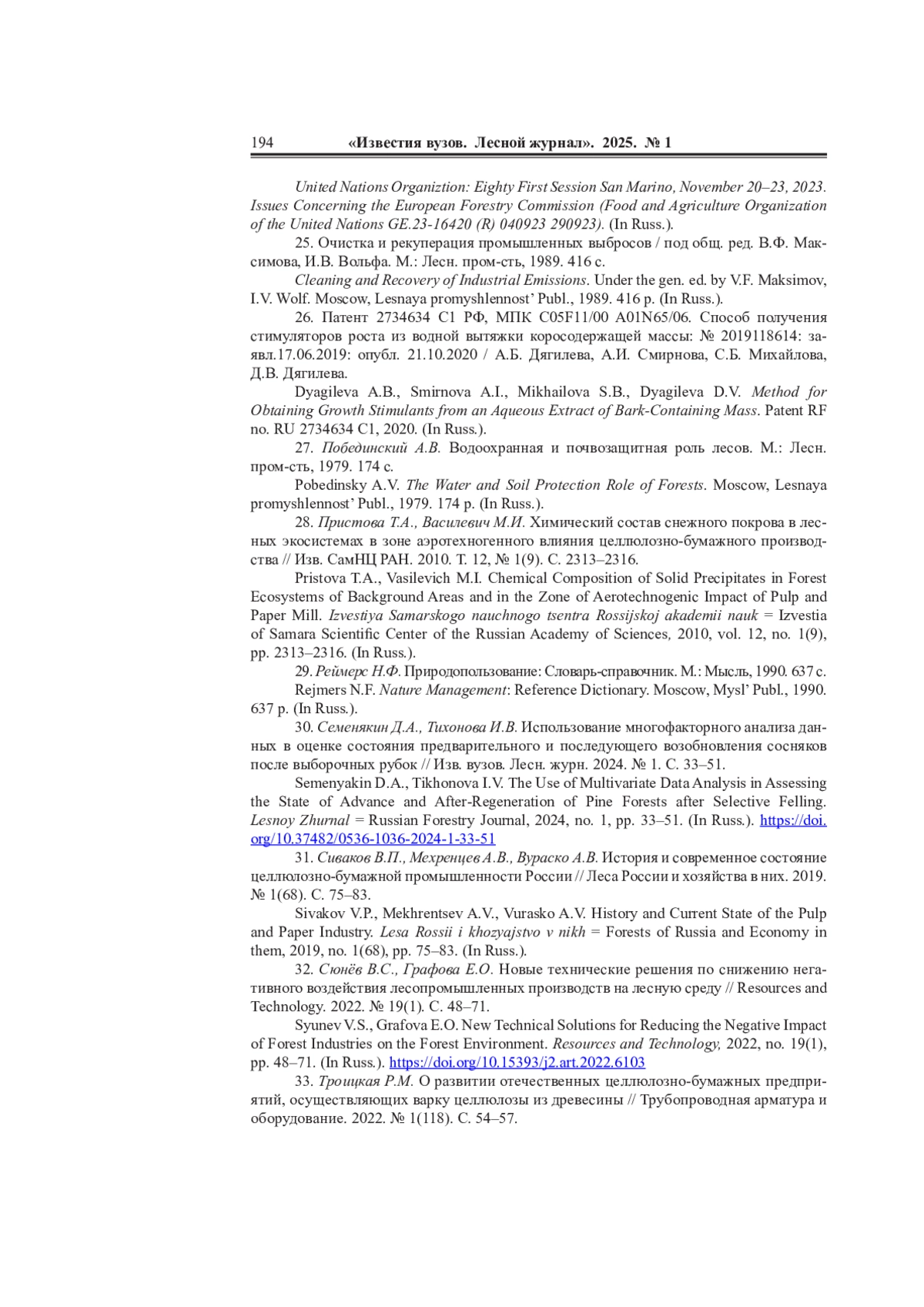 32. Сюнёв В.С., Графова Е.О. Новые технические решения по снижению негативного воздействия лесопромышленных производств на лесную среду // Resources and Technology. 2022. No 19 (1). С. 48-71.