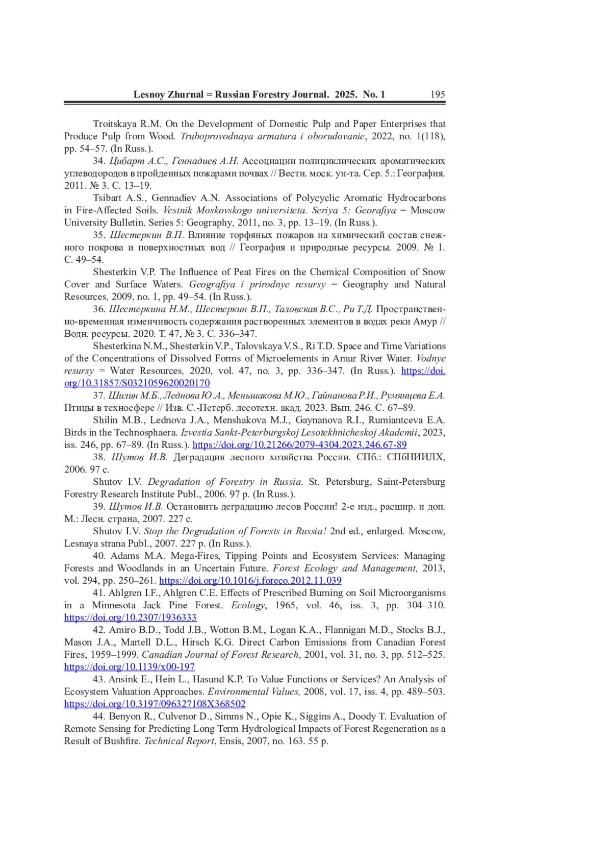 5. Гераськина А.П., Тебенькова Д.Н., Eршов Д.В., Ручинская E.В., Сибирцева Н.В., Лукина Н.В. Пожары как фактор утраты биоразнообразия и функций лесных экосистем // Вопр. лесн. науки. 2021. Вып.: Лесные пожары. Т. 4. No 2. Ст. No 82. Режим доступа: https://jfsi.ru/wp-content/uploads/2022/04/Wildfires_as_a_factor-2021.pdf (дата обращения: 17.01.25). EDN: ORKLLA