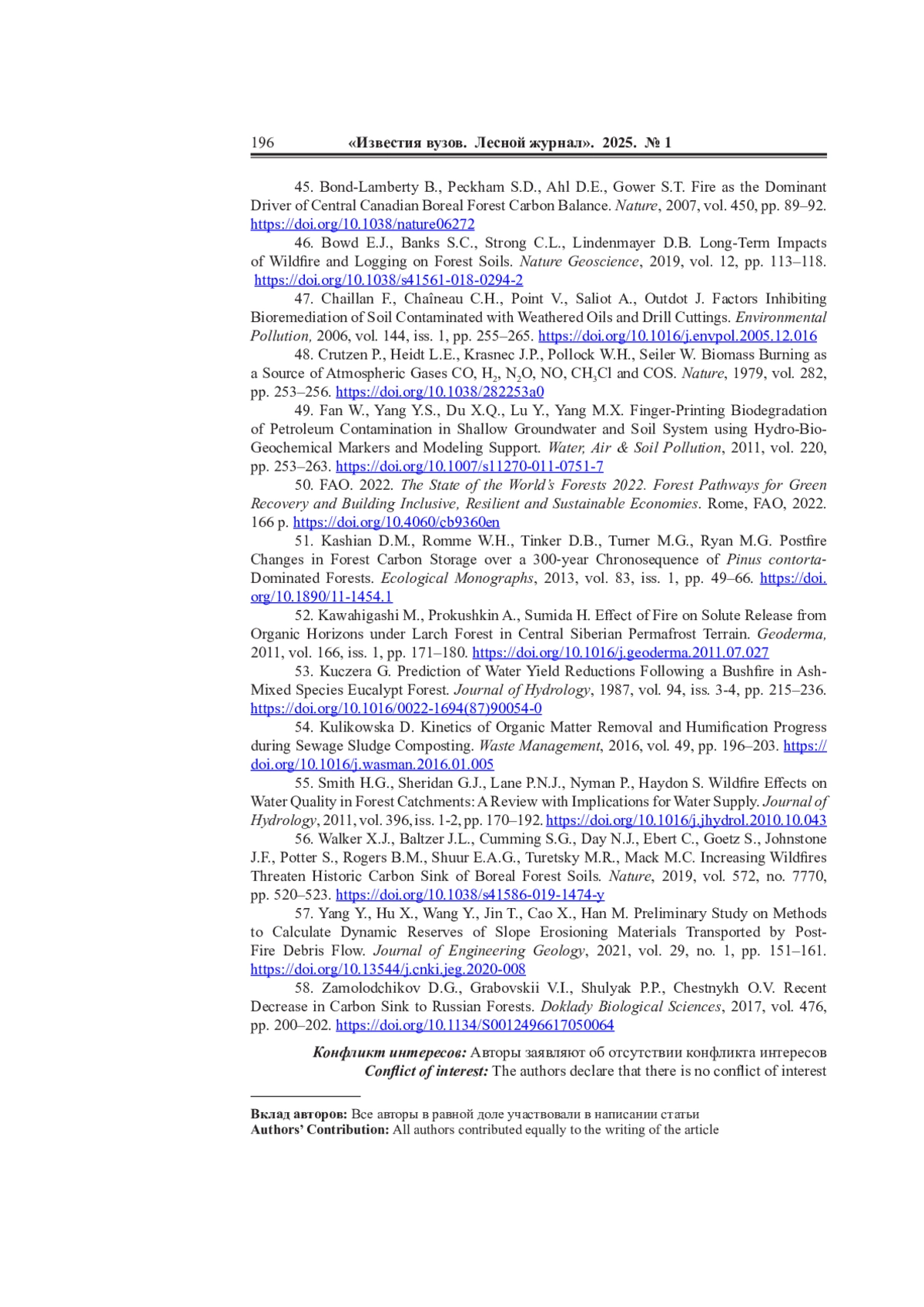 45. Bond-Lamberty B., Peckham S.D., Ahl D.E., Gower S.T. Fire as the Dominant Driver of Central Canadian Boreal Forest Carbon Balance. Nature, 2007, vol. 450, pp. 89-92. DOI: 10.1038/nature06272 EDN: LWRKTF